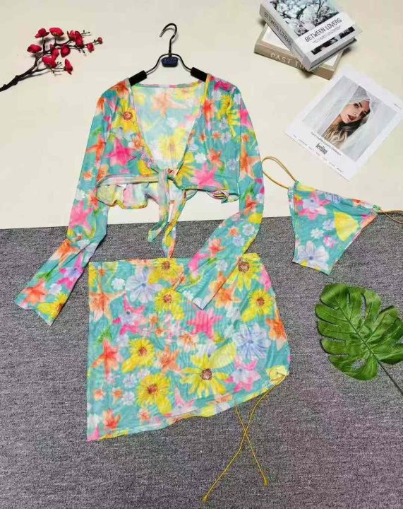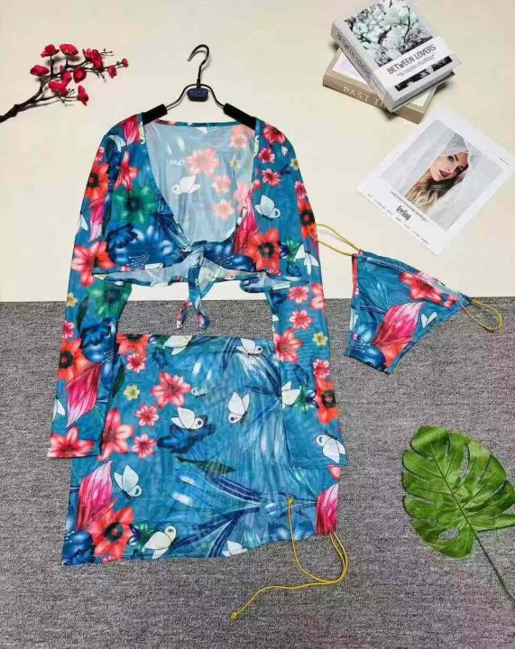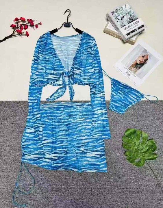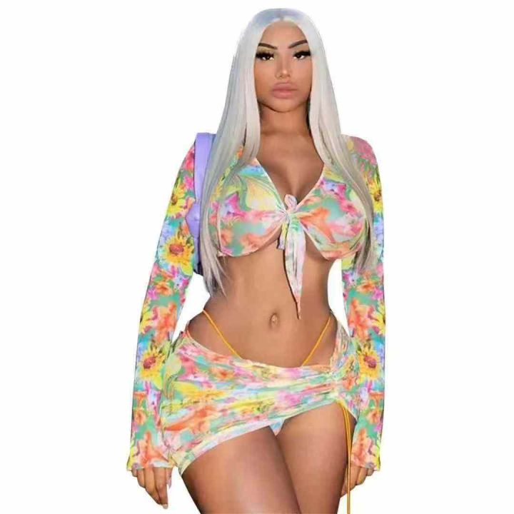 欧美女装性感网纱印花 抽绳长袖短裙三件套,数量:124套,码数:M-2XL,图片款,品质好,有独立包装。