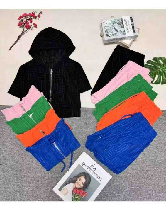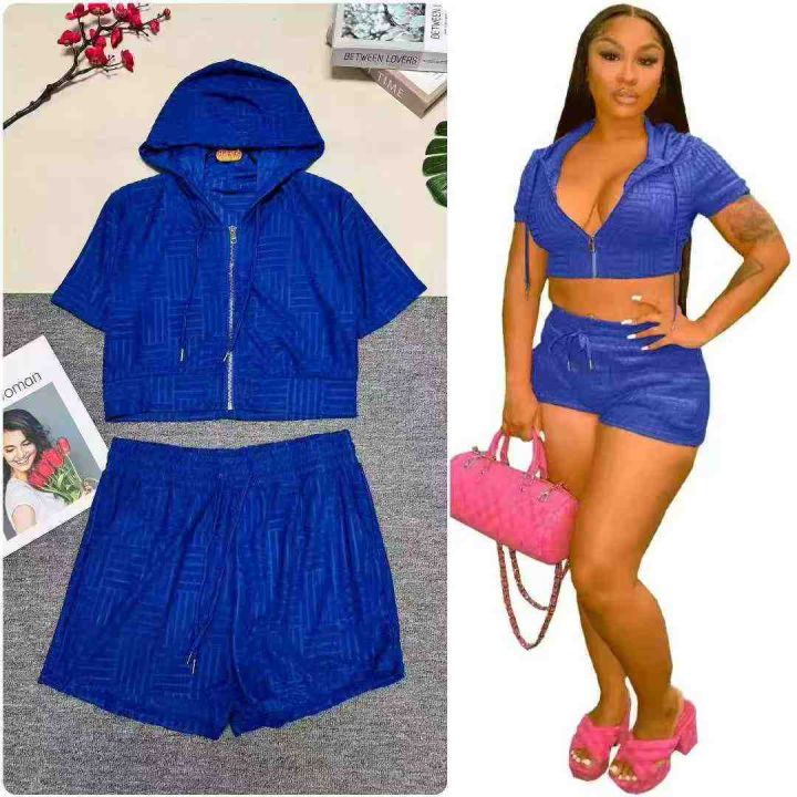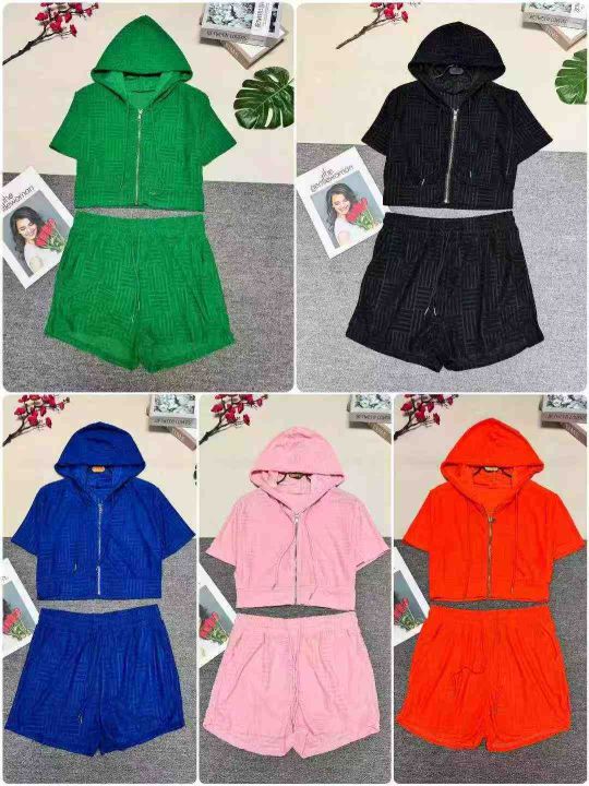 欧美新品连帽提花拉链开衫紧身短裤时尚休闲套装 ,数量:350套左右,码数:S-2XL,整款多色,品质好,有独立包装。
