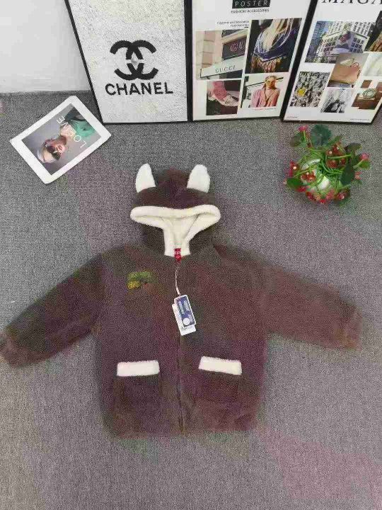 品牌高品质童装颗粒绒毛绒带帽外套 数量500件左右 尺码110--160 图片色两款 质量很好品牌货 独立包装带吊牌 货品整洁质佳!