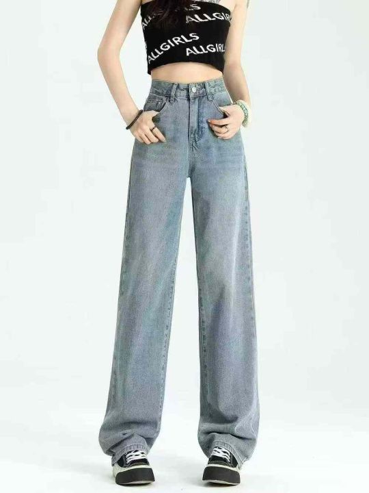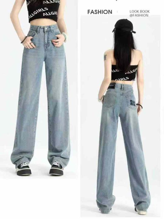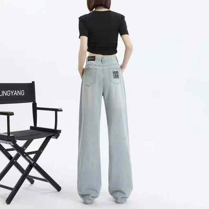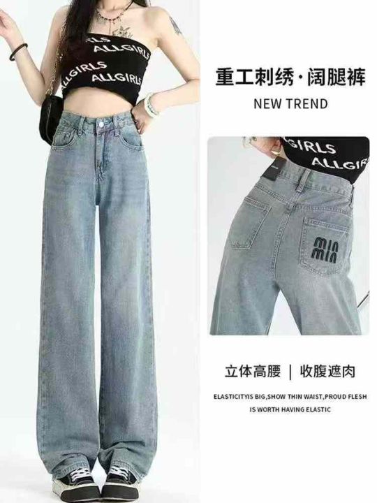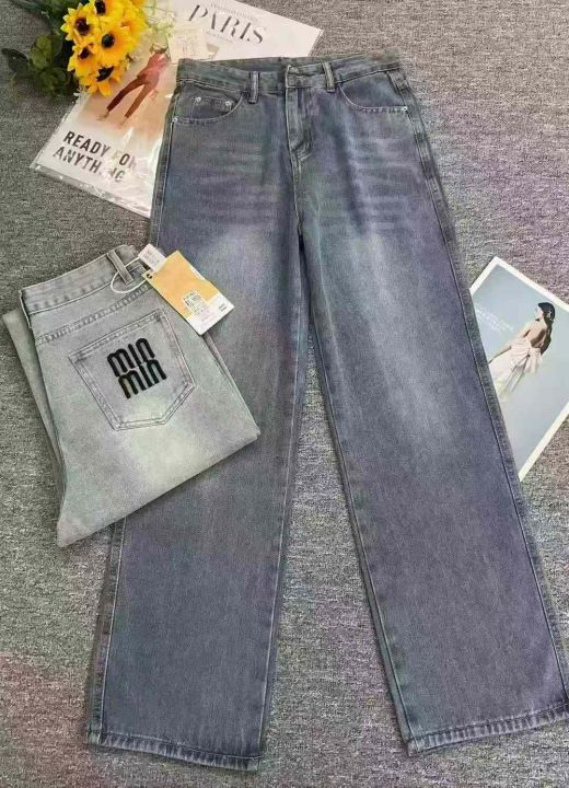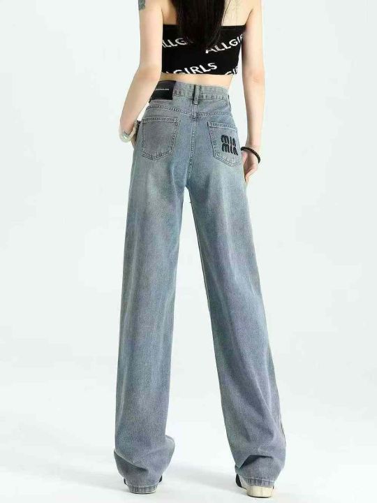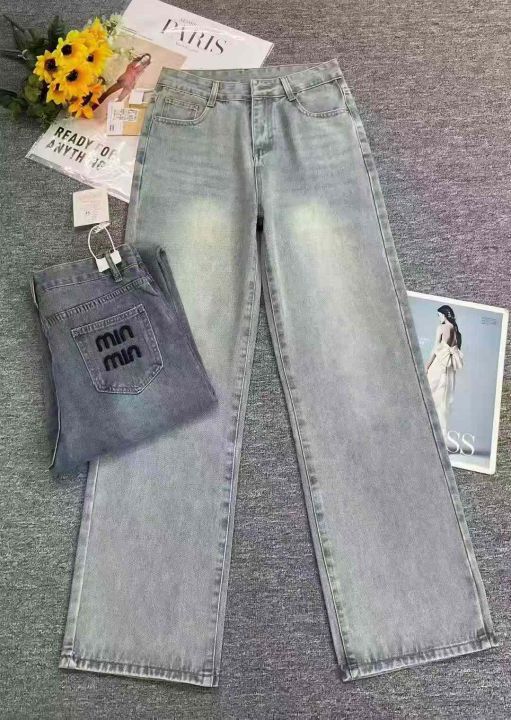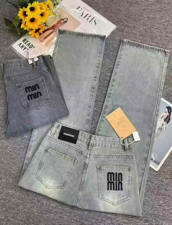 秋季新款高品质高腰显瘦宽松字母刺绣水洗棉窄版直筒阔...