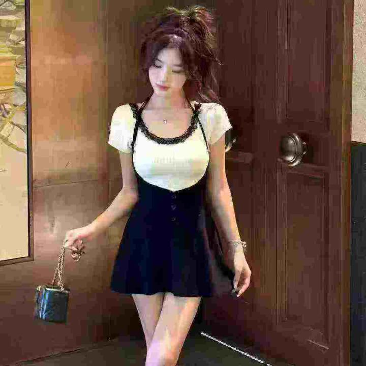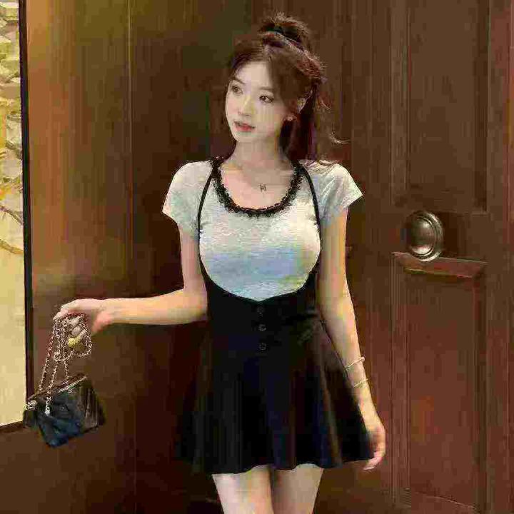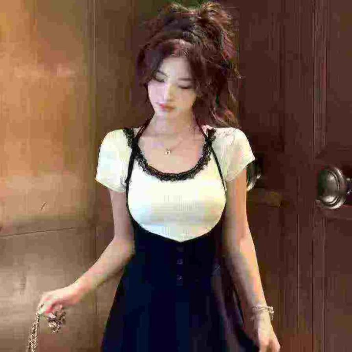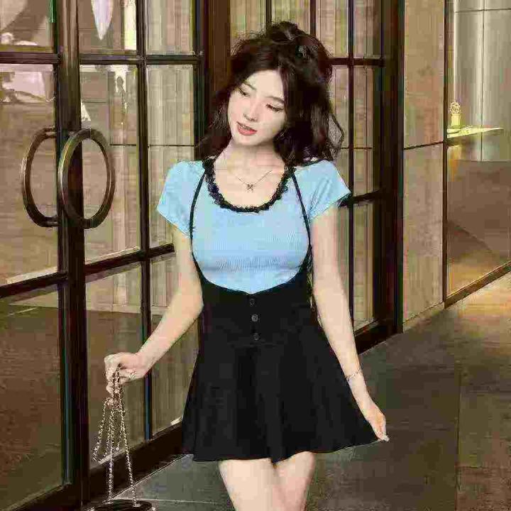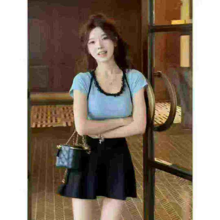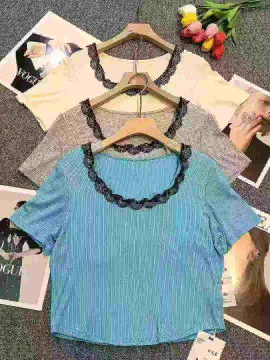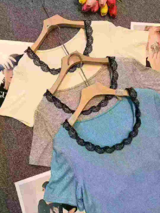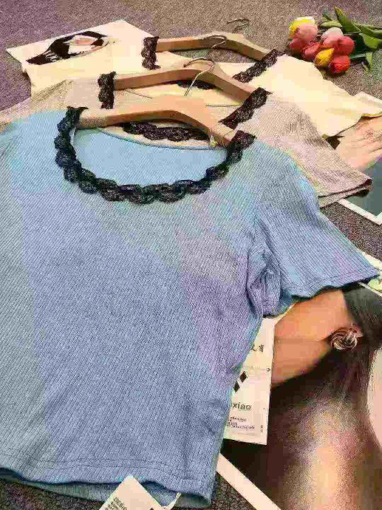 品牌纯欲风U领蕾丝拼接短袖上衣,75件左右,[爱心]蓝色灰色为主,[666]码数3XL穿100斤-150斤,万佳档口新货,[色]原包装️无瑕疵,[勾引]实体店高品质[勾引]