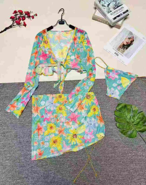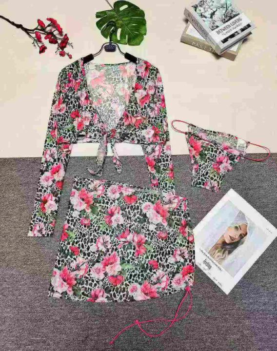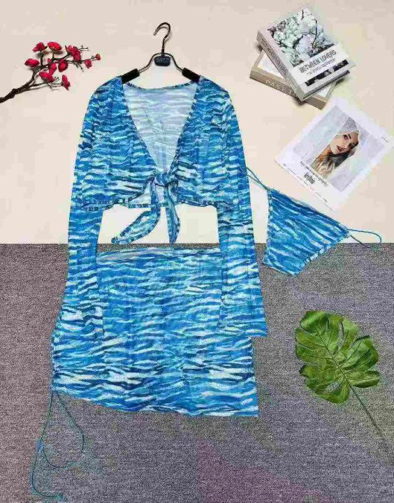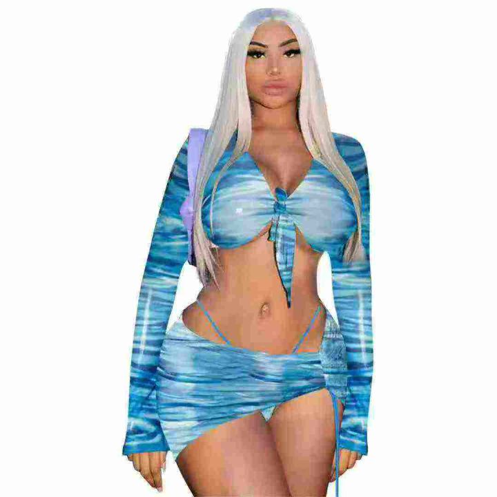 欧美女装性感网纱印花 抽绳长袖短裙三件套,数量:124套,码数:M-2XL,图片款,品质好,有独立包装。