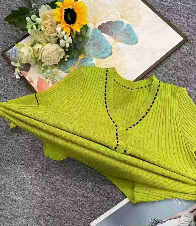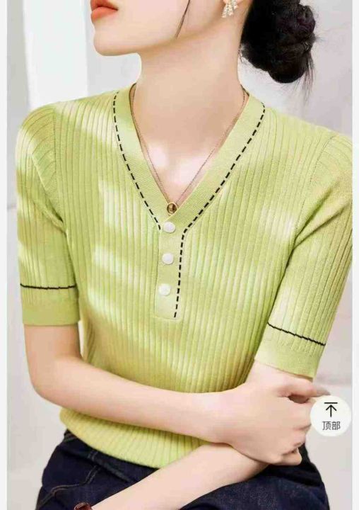 夏季新款薄款精纺V领小香风撞色弹力修身韩版半袖针织T桖,独立包装,面料软糯弹力大,100件左右,全清5.9元超低价秒杀!