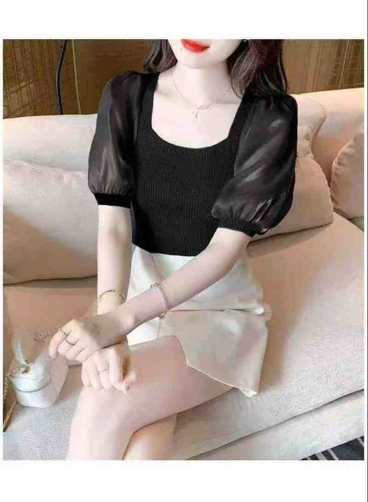 夏季新款时尚法式方领拼接泡泡袖弹力修身针织小衫,独立包装,均码面料柔软舒适弹力大,黑白色为主,930件,全清6.9元超低价秒杀!分货加一!