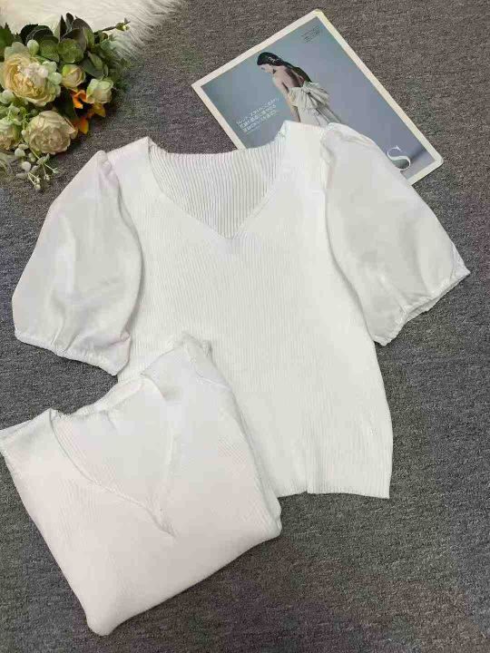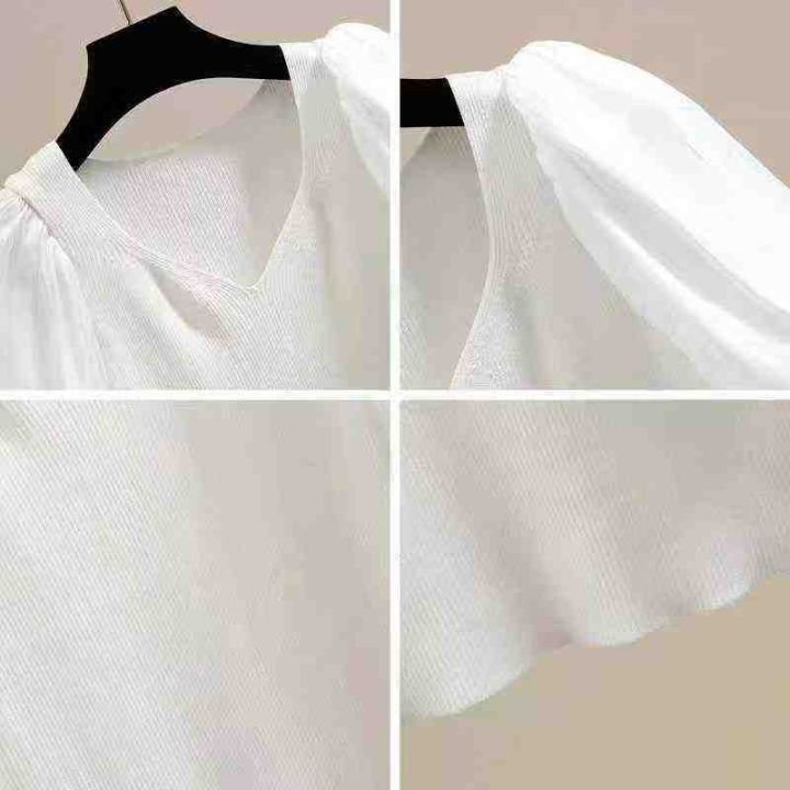 夏季新款法式复古v领雪纺拼接泡泡袖冰丝短袖针织小衫...