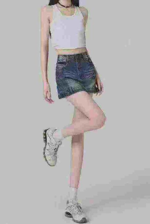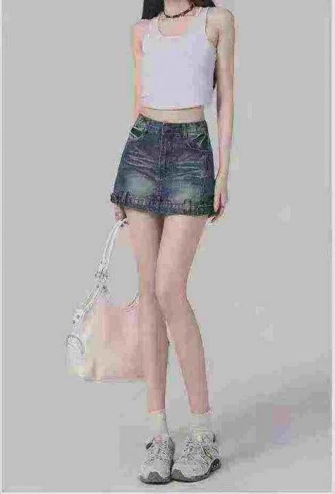 夏季新款辣妹风复古时髦百搭防走光洗水棉牛仔短裙,独...