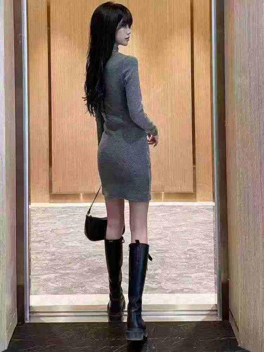 高级感半高领褶皱紧身包臀连衣裙春秋气质打底短裙御姐...