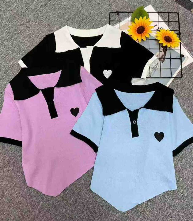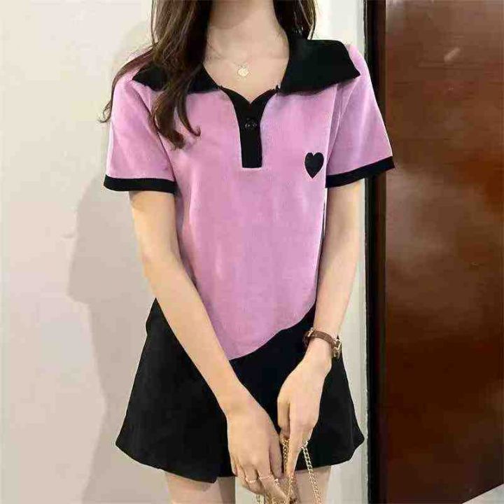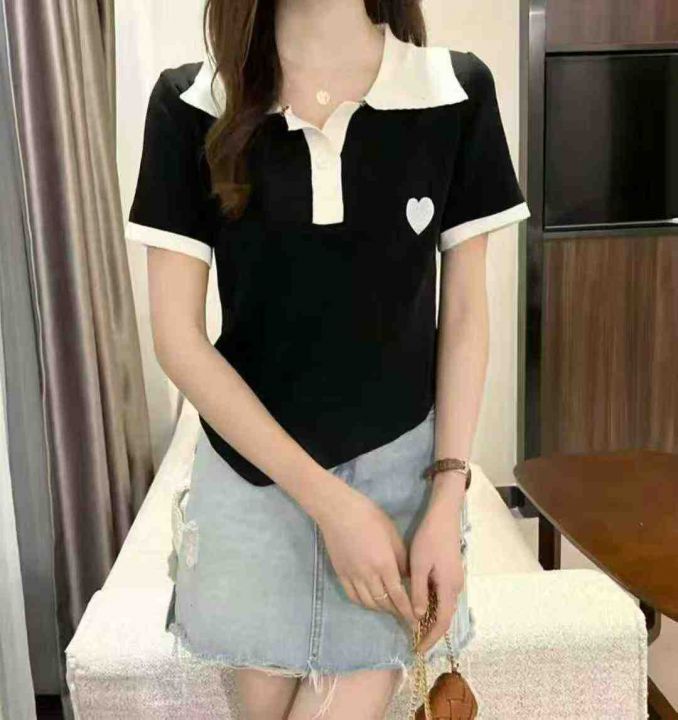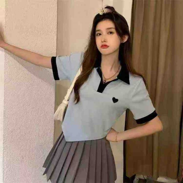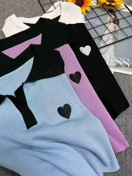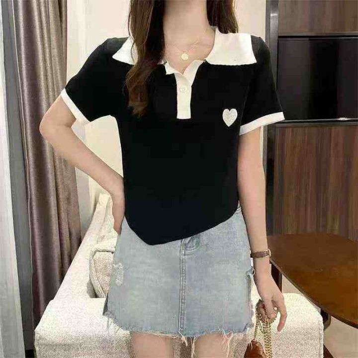 夏季新款小众设计感不规则polo领甜美学院风针织小衫,...