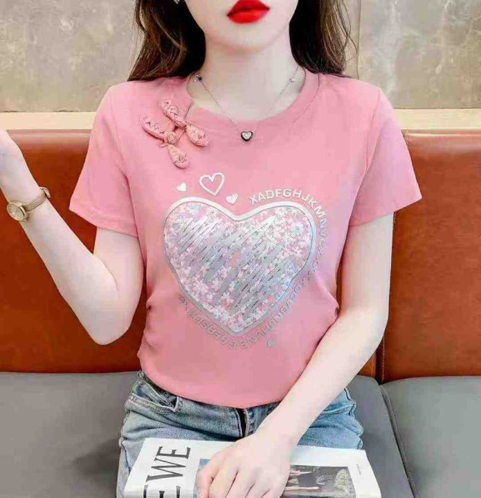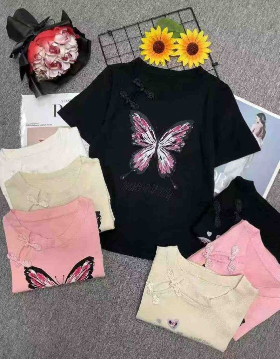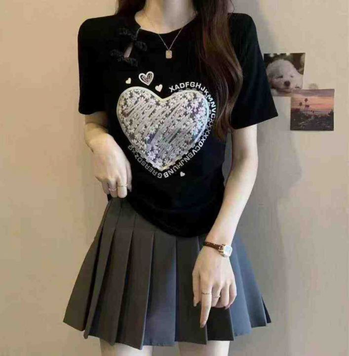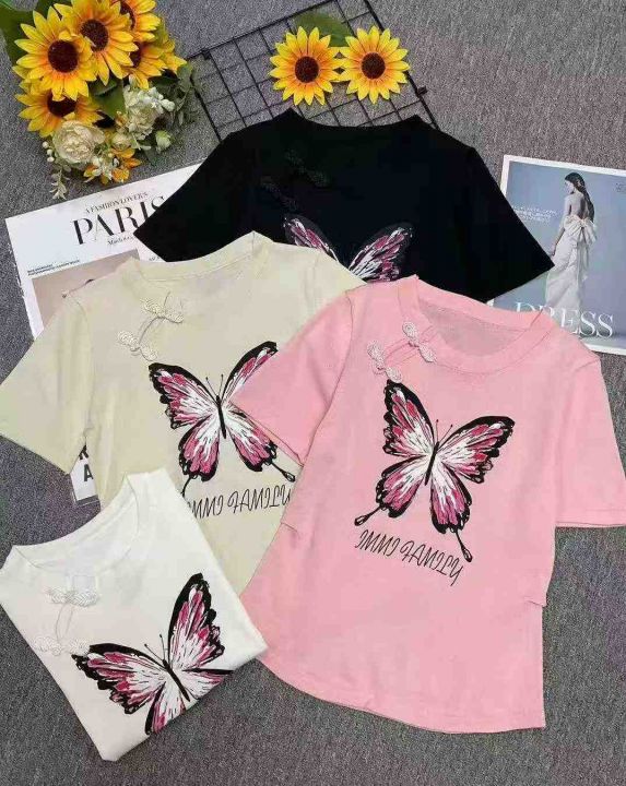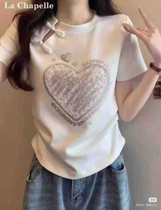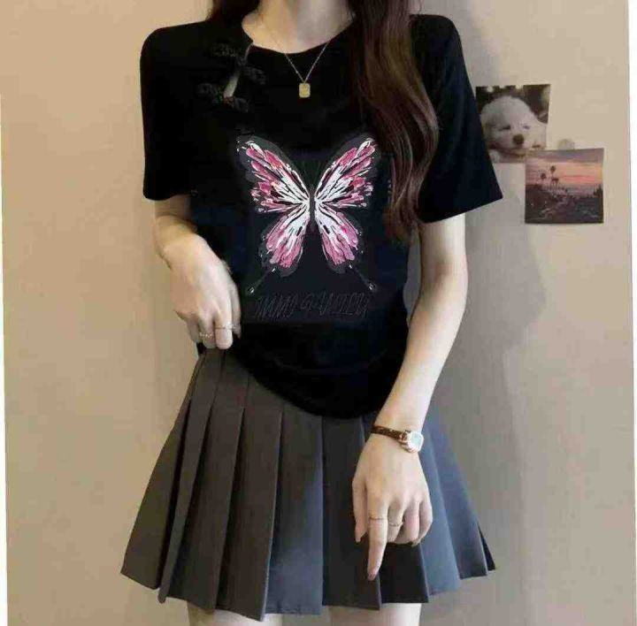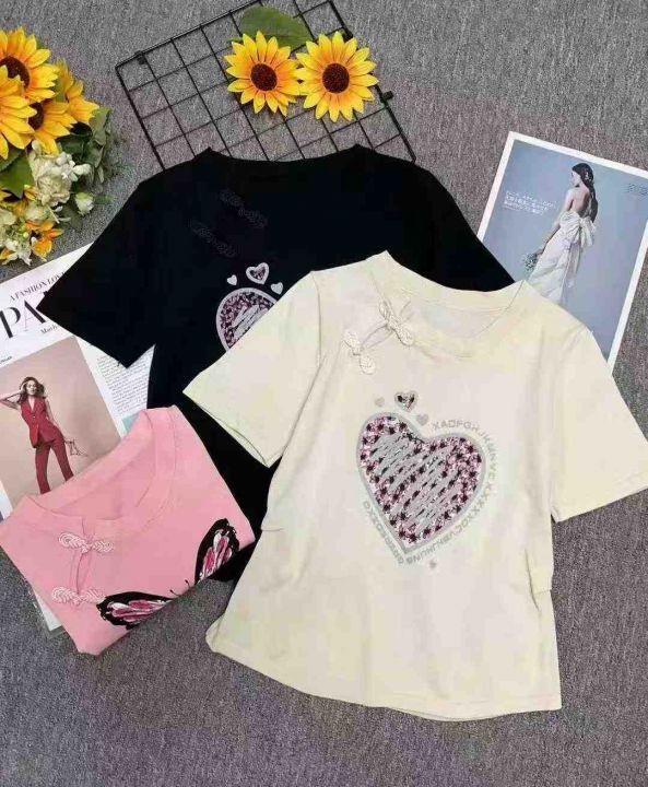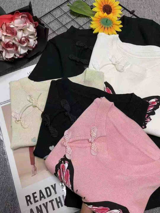 夏季新款新中式盘扣复古蝴蝶爱心印花弹力修身显瘦针织短袖T桖,独立包装,均码面料柔软舒适弹力大,196件,全清6.9元超低价秒杀!
