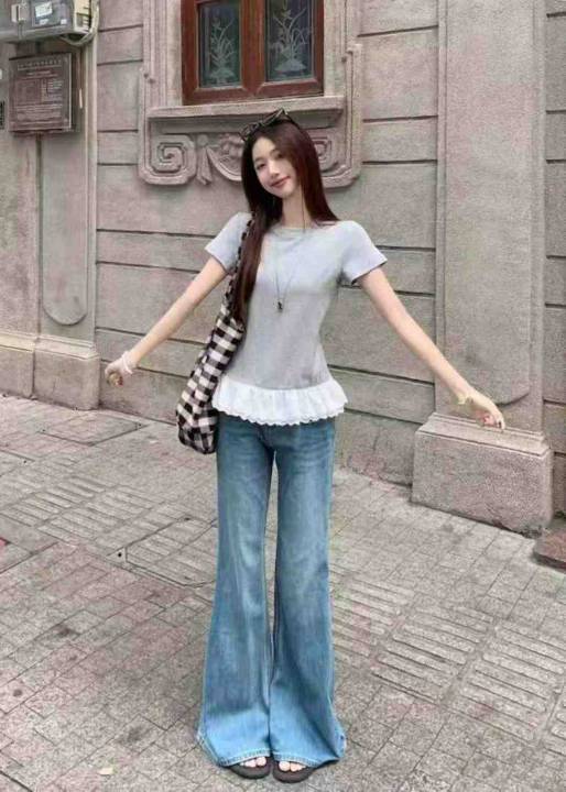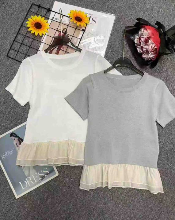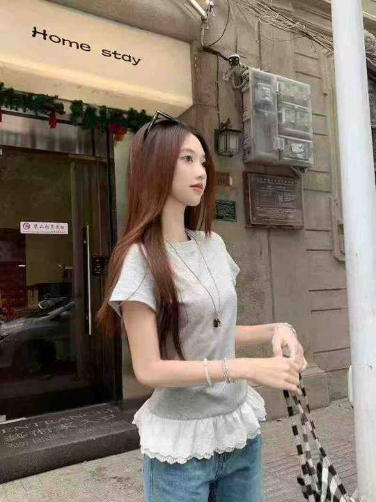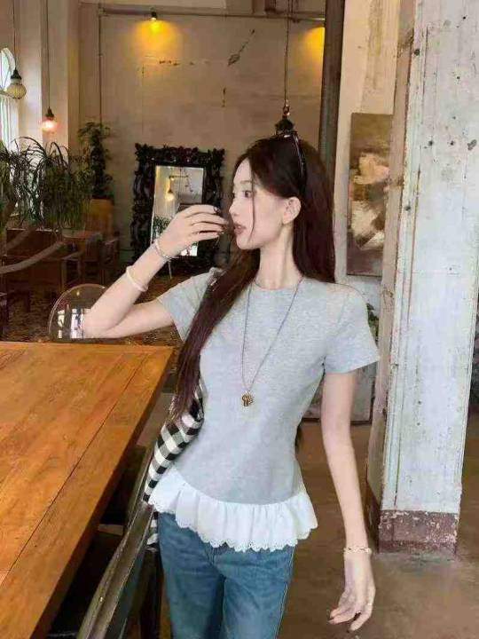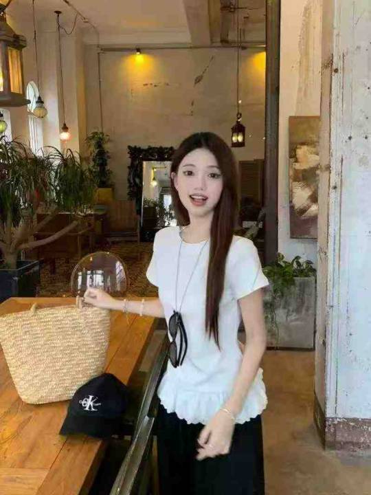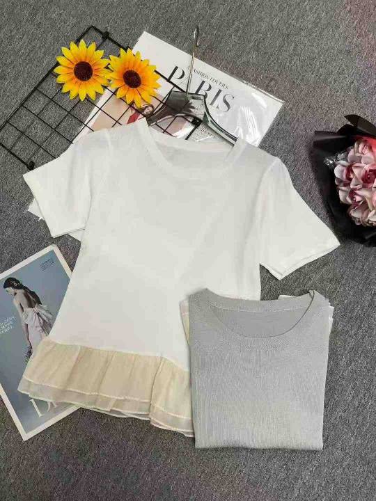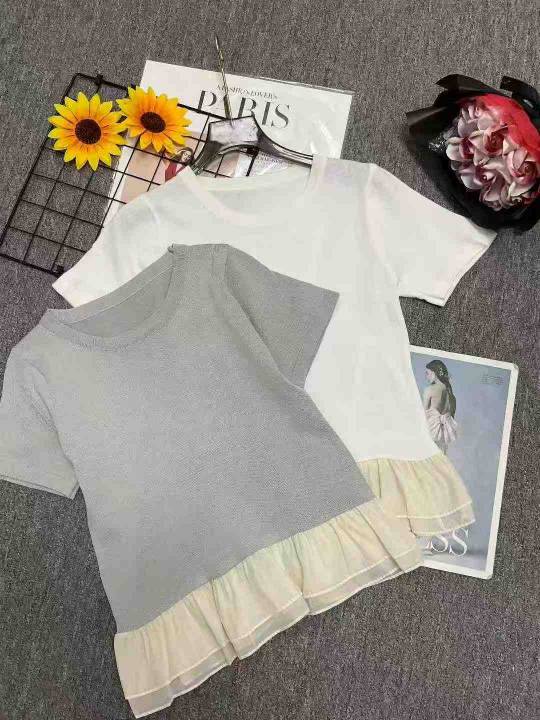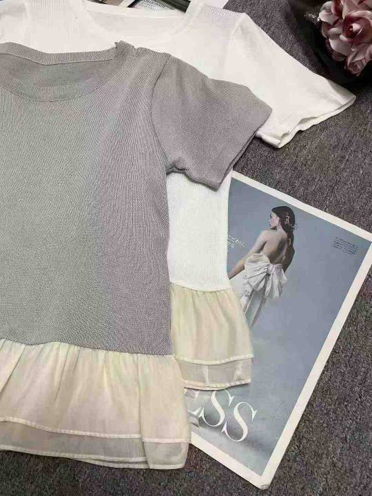 夏季新款法式假两件荷叶边拼接针织短袖t恤,独立包装...