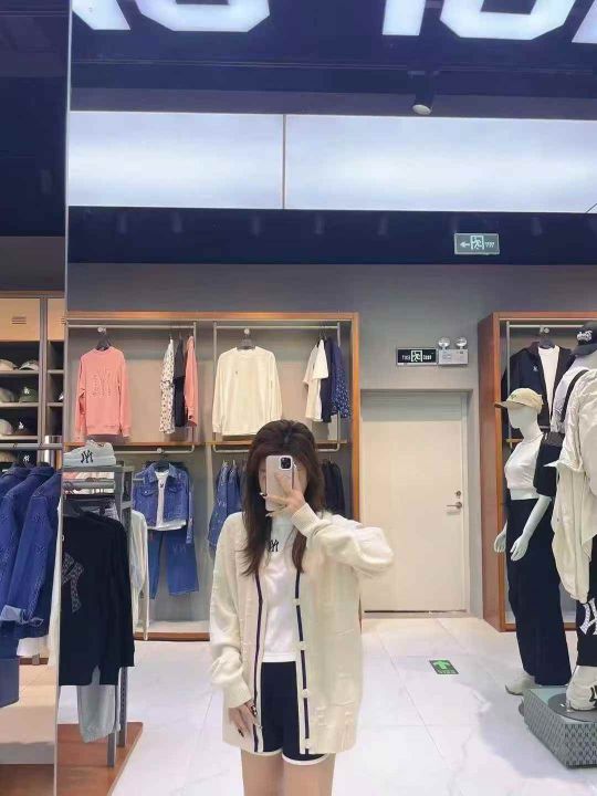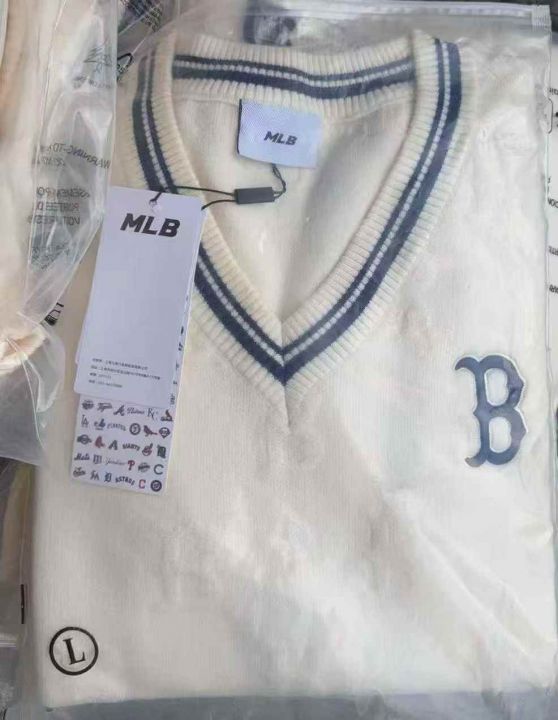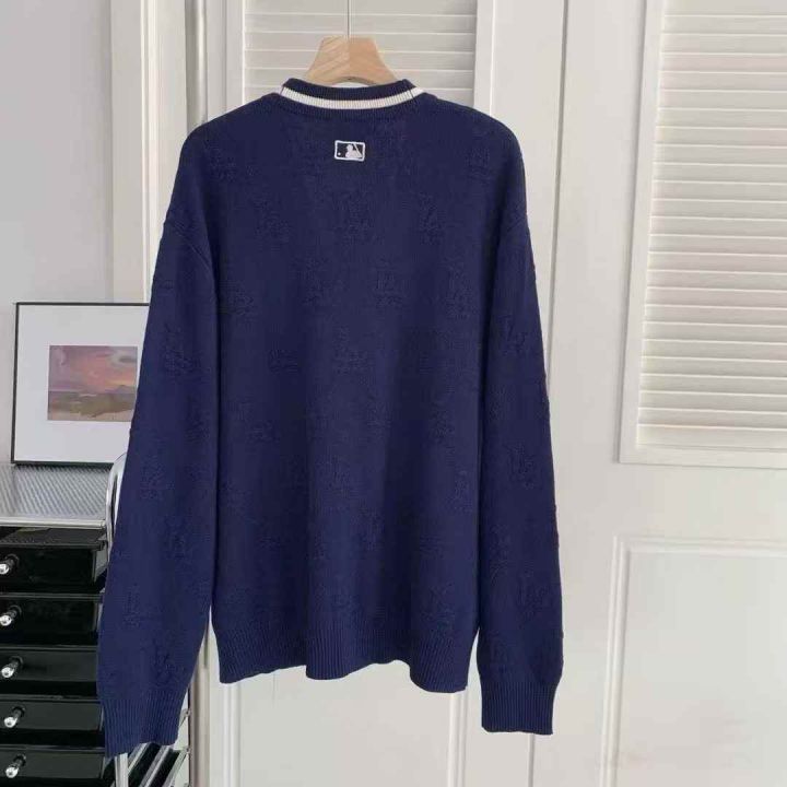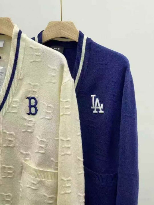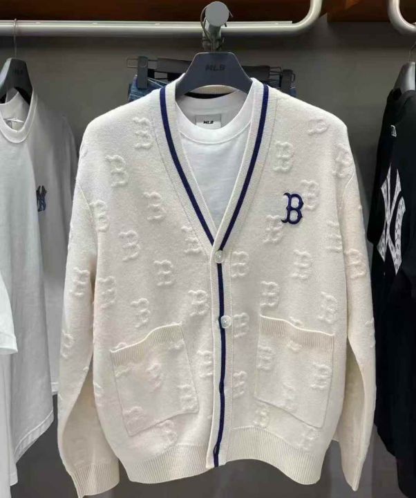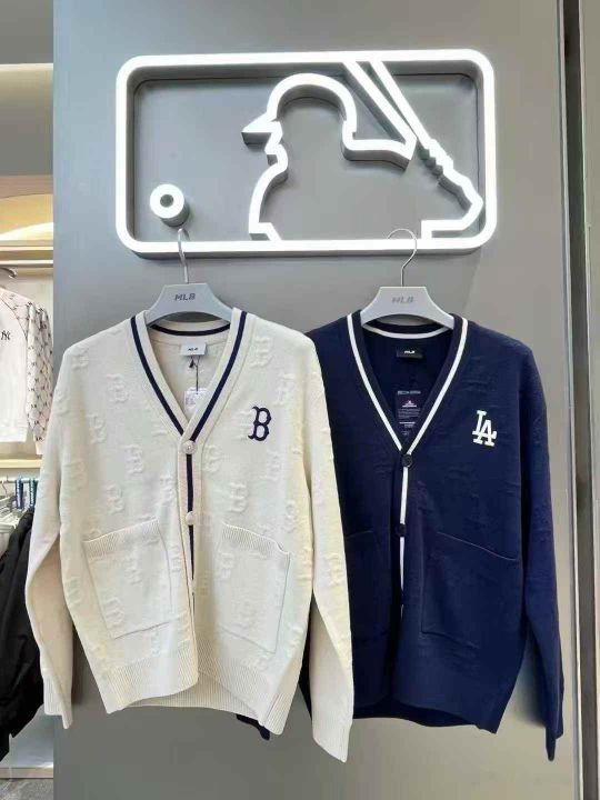 MLB男女情侣立体浮雕老花撞色针织开衫外套25秋冬新 毛衣外套 白色 蓝色 S M L XL 62件处理 米白是同款鸡心领没有扣子!