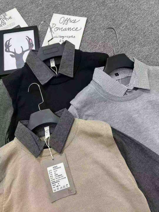 ☕️男装假两件毛衣488件全清13.8元 分货14.8元,码数M到3XL 单款3色,独立包装。男士春秋款新款男装衣服商务休闲男款衬衫领针织衫