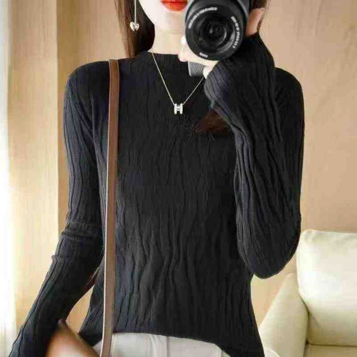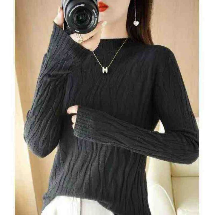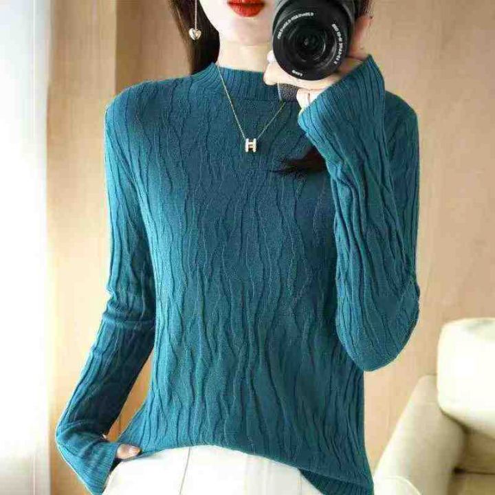 秋冬新款纯色文艺复古螺纹褶皱长袖半高领包芯纱套头毛...