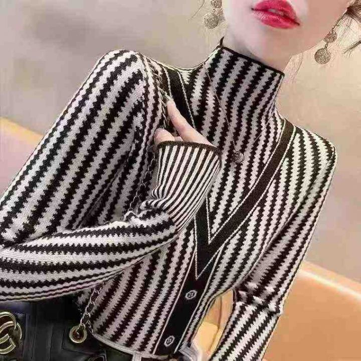 秋冬新款半高领时髦时尚洋气条纹提花包芯纱套头毛衣,...