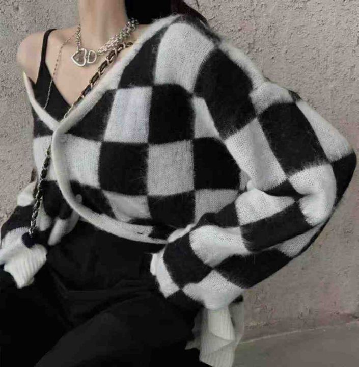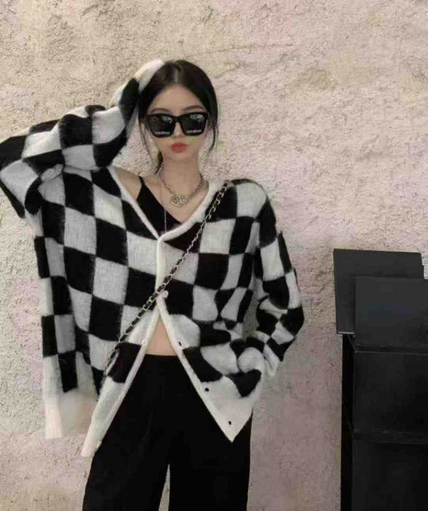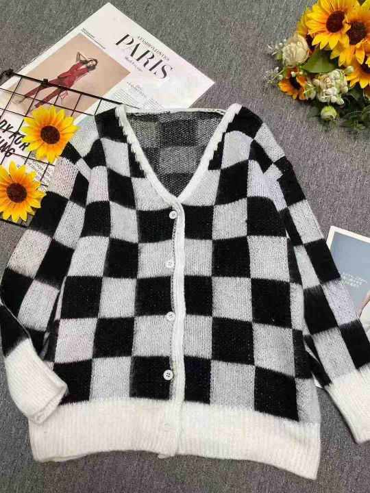 秋冬新款慵懒风棋盘格设计感宽松毛衣开衫,独立包装,...