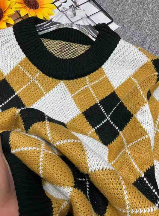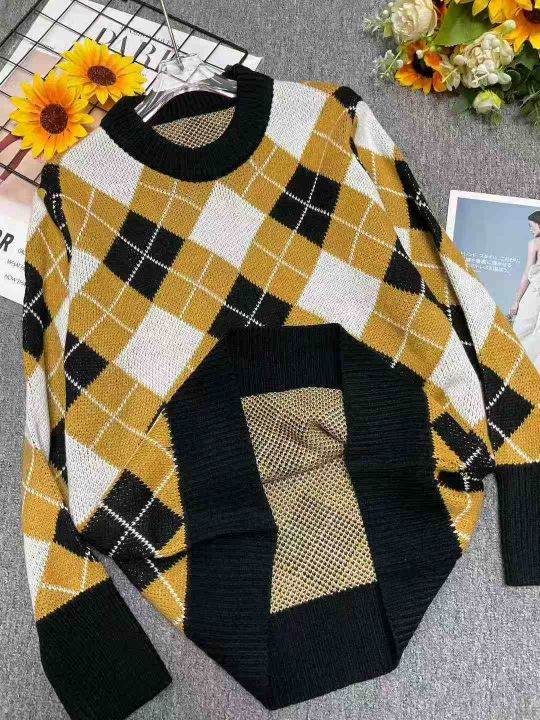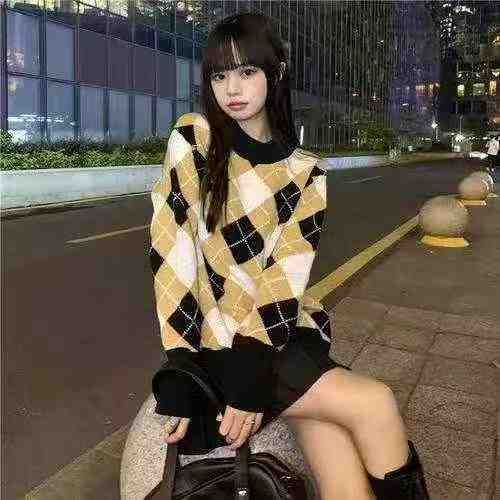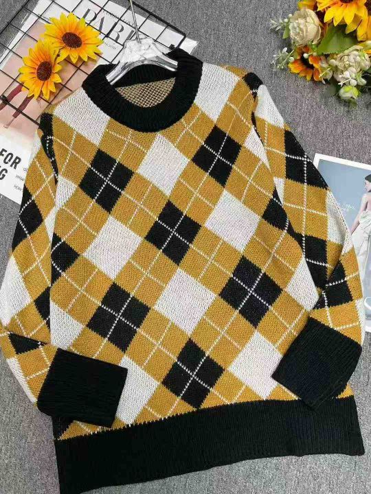 秋冬新款韩版宽松慵懒风菱格提花圆领北极绒套头毛衣,...