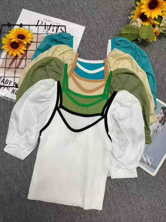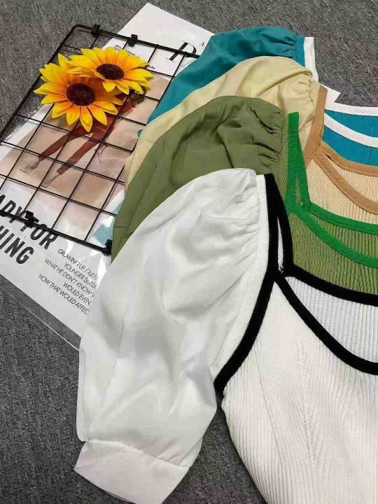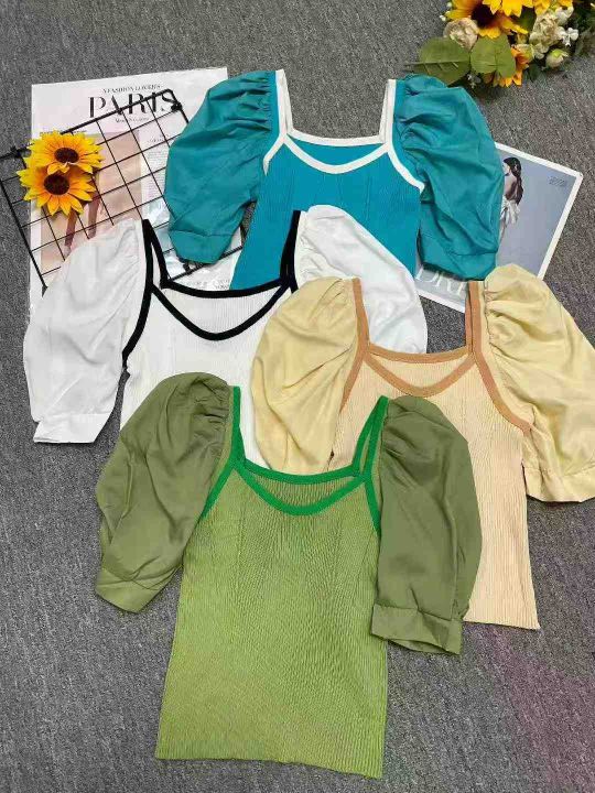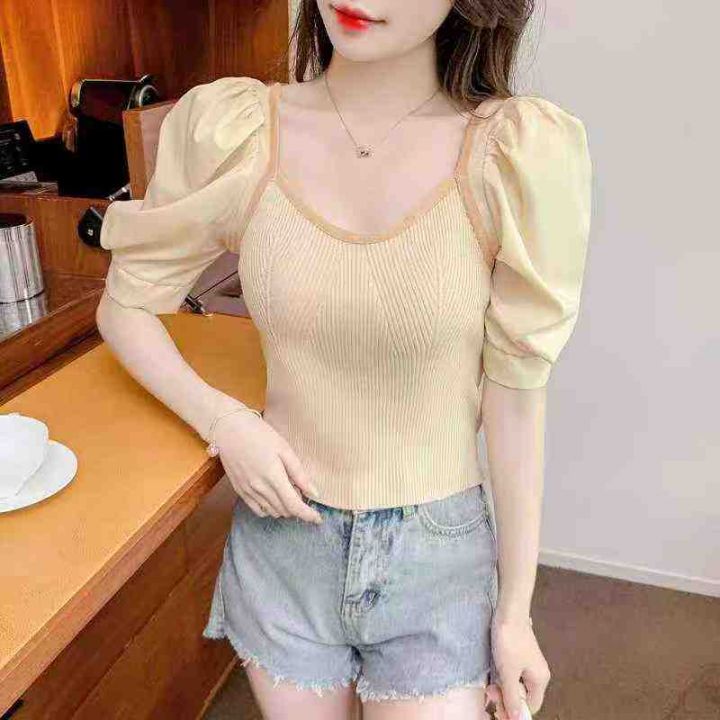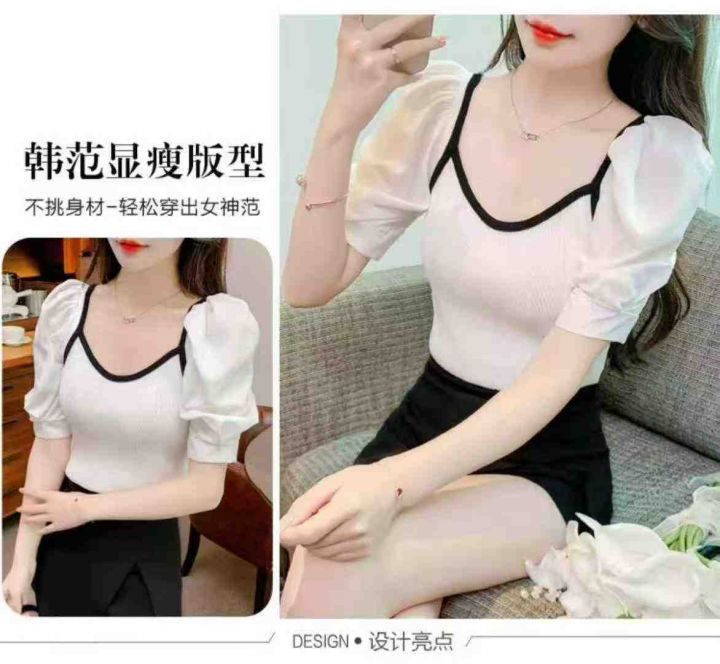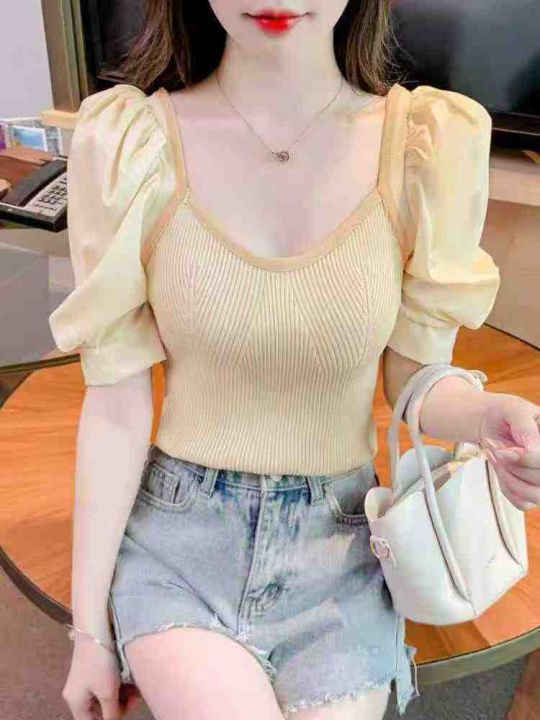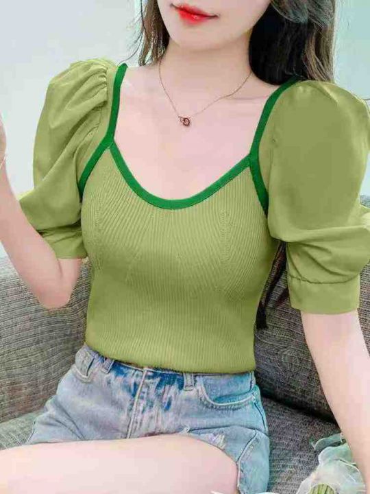 夏季新款法式泡泡袖方领锁骨弹力修身拼色简约大方小众设计感韩版短款针织小衫,独立包装,均码面料柔软舒适弹力大,240件,全清5.9元超低价秒杀!分货加一!