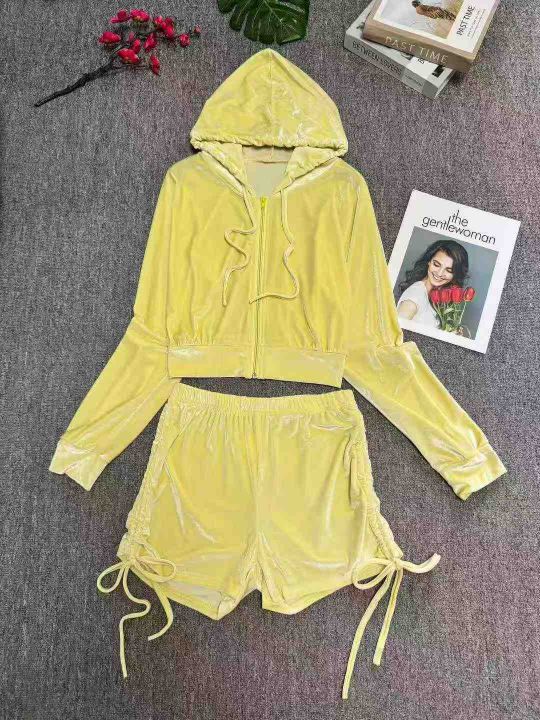 时尚辣妹金丝绒连帽长袖拉链开衫上衣休闲短裤两件套,数量:102套,码数:S-2XL,图片款,品质好,有独立包装。