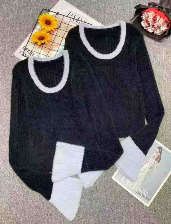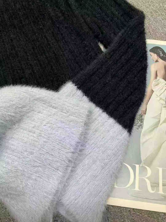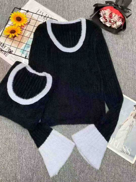 秋冬新款仿水貂毛撞色喇叭袖套头毛衣,独立包装,均码...