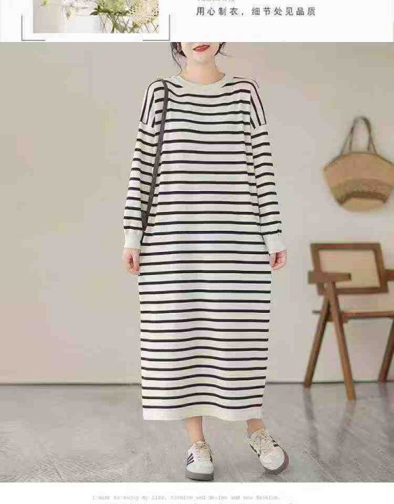 秋冬新款大版宽松慵懒风撞色条纹大长款针织连衣裙,独...