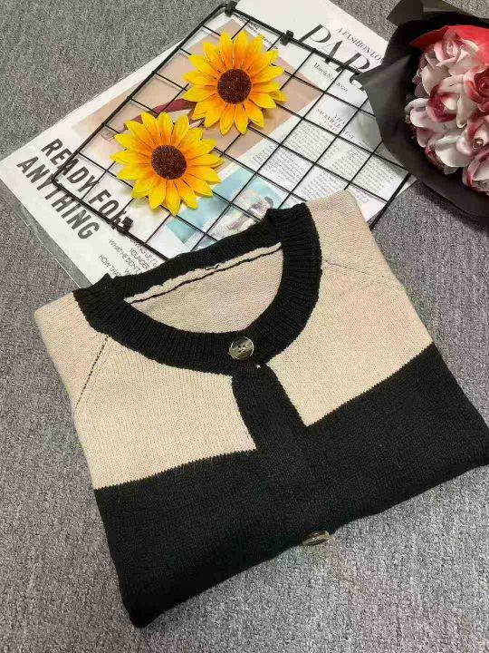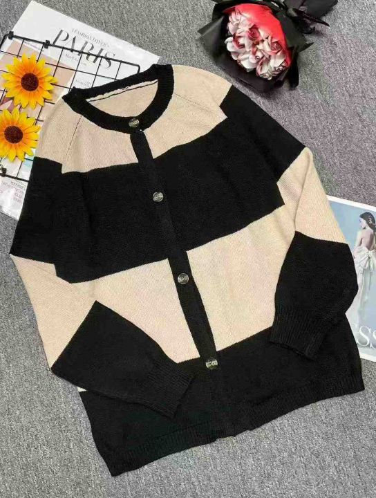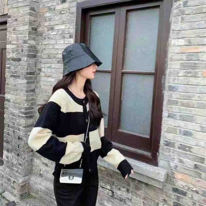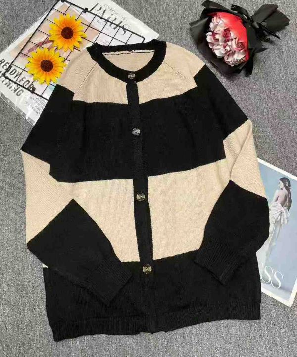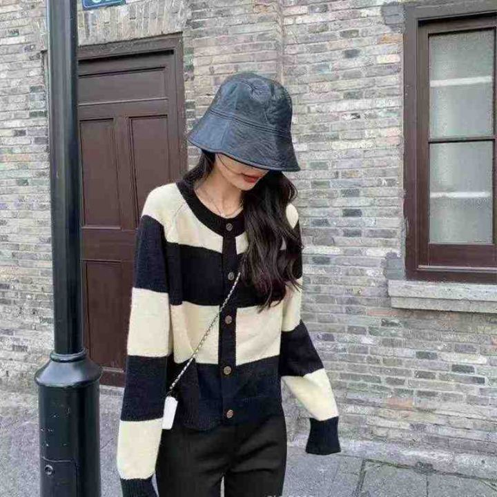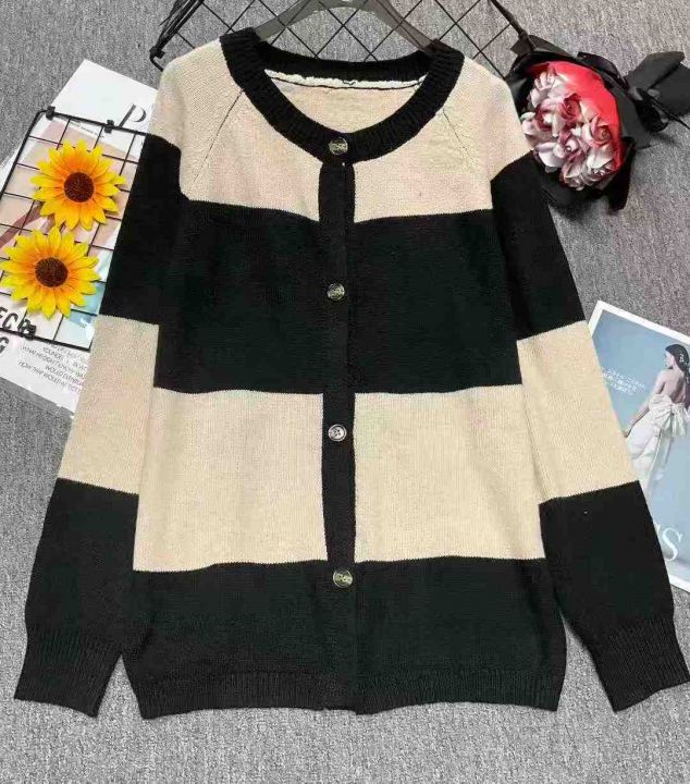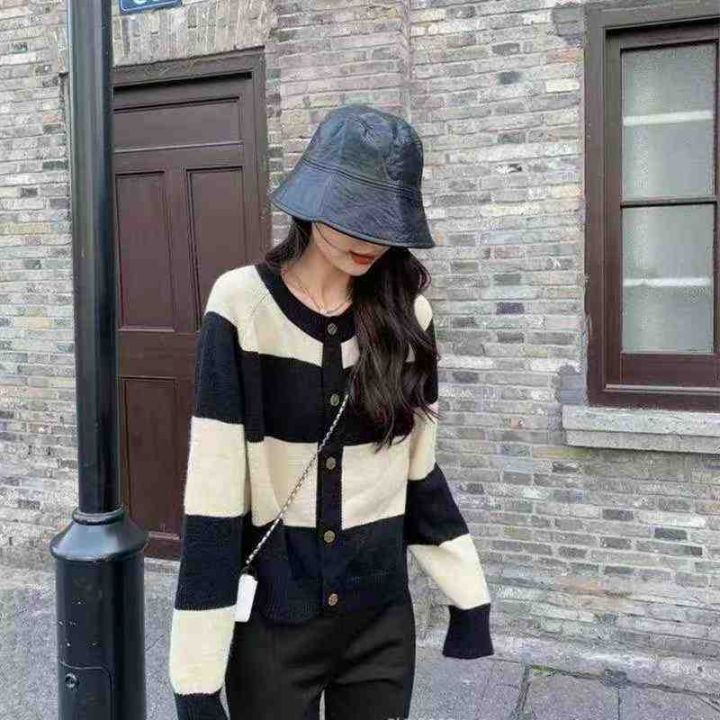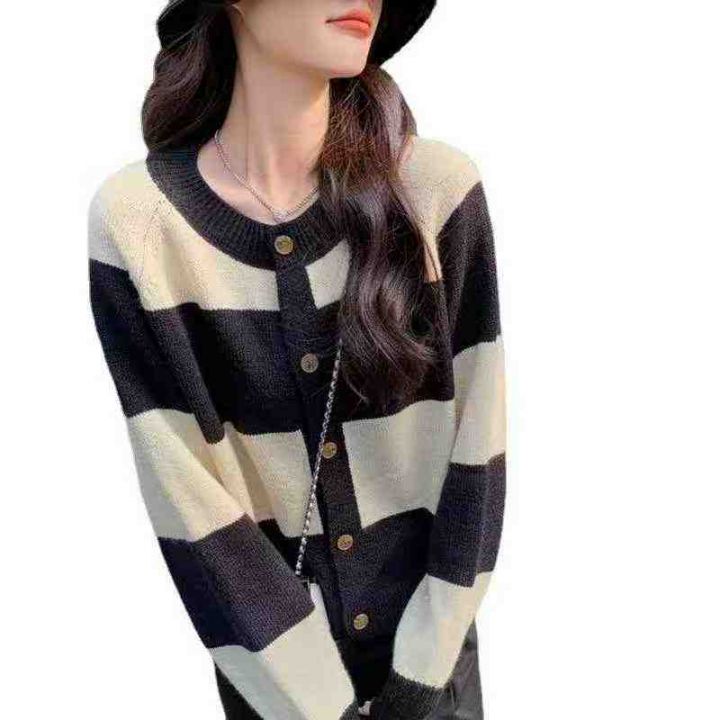 秋季新款宽松慵懒风条纹撞色针织毛衣开衫,独立包装,...