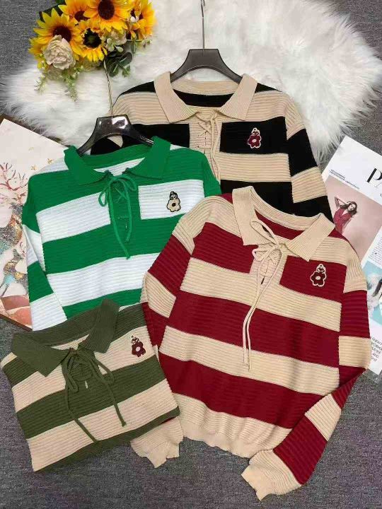 秋季新品复古条纹撞色设计感慵懒风POLO领长袖针织小衫,独立包装,均码面料...