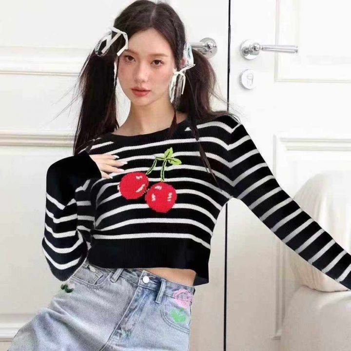 秋冬新款美式时尚辣妹樱桃刺绣植绒撞色条纹宽松显瘦套头毛衣,独立包装,均...