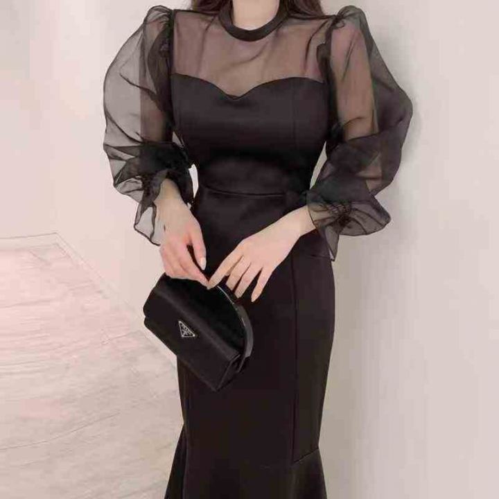 300条日单圆领拼接网纱微透喇叭袖收腰显瘦纯色开衩鱼尾连衣裙,质量超好!...