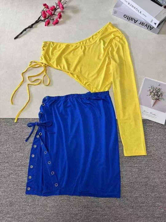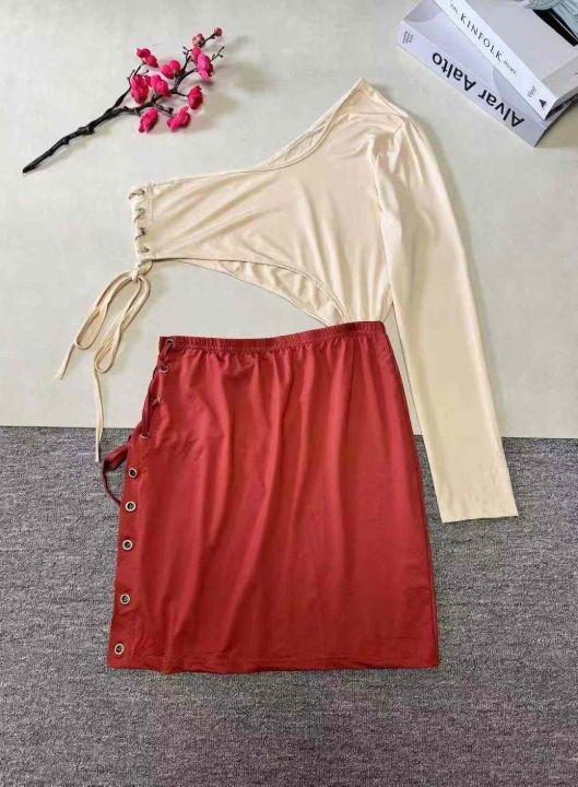 欧美性感时尚休闲绑带斜肩长袖裙子,整款三色,数量300件左右,码数S-2XL码,高弹力品质好,拉链式独立包装。