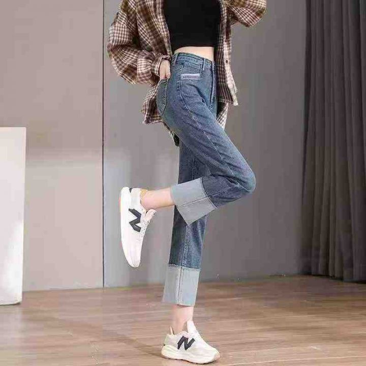 翻边直筒牛仔裤女弹力春秋夏复古卷边裤脚拼接小个子烟...