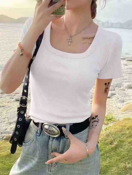 [月亮]:5.5清1042件[月亮]:简约时尚方领锁骨短袖T恤...