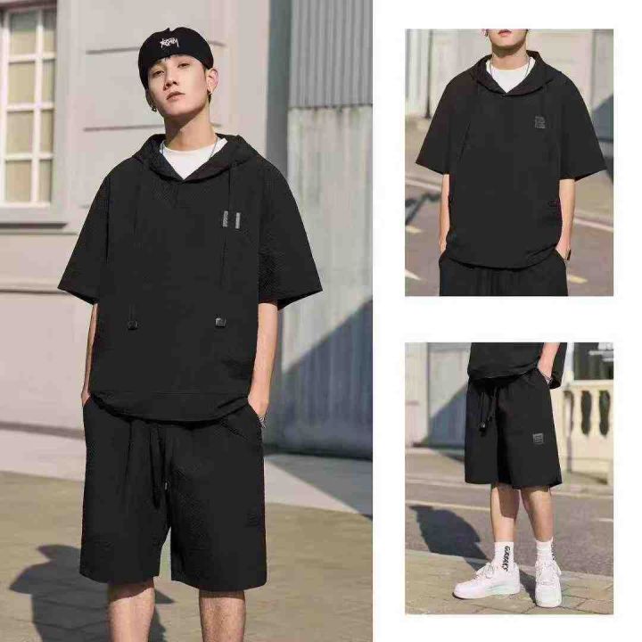 华夫透气舒适面料潮牌男士短袖短裤休闲运动宽松两件套套装,独立包装,单色单款,码数1-6码,数量234件,货号0910#27