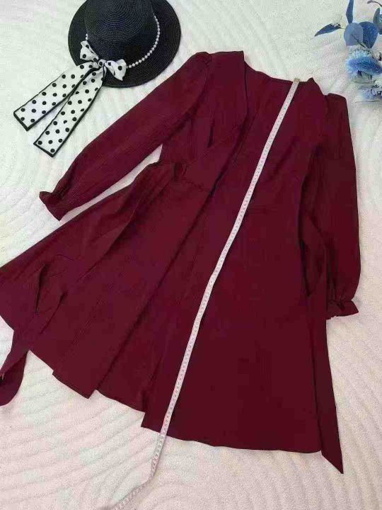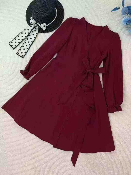 纯色裹胸款春秋季衩领束带灯笼袖长袖连衣裙