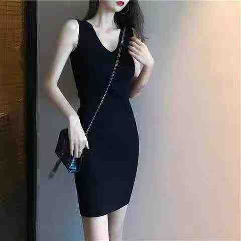 早秋新款法式纯欲性感辣妹弹力修身包臀黑色背心吊带针织连衣裙,独立包装,...