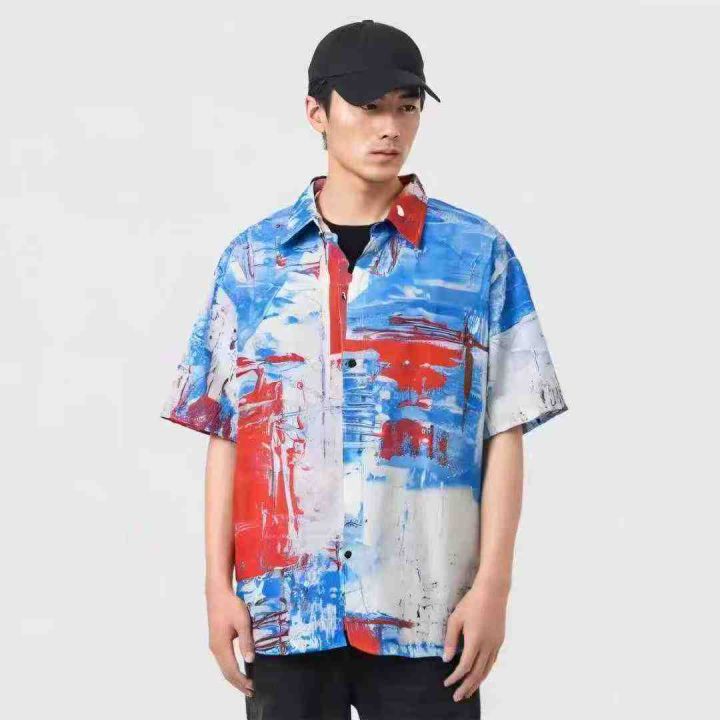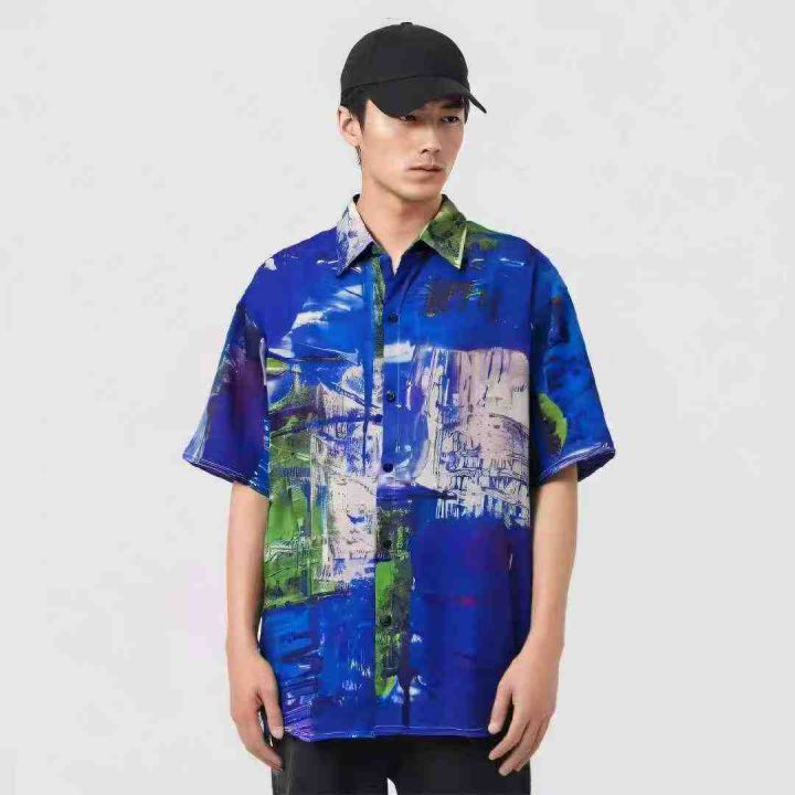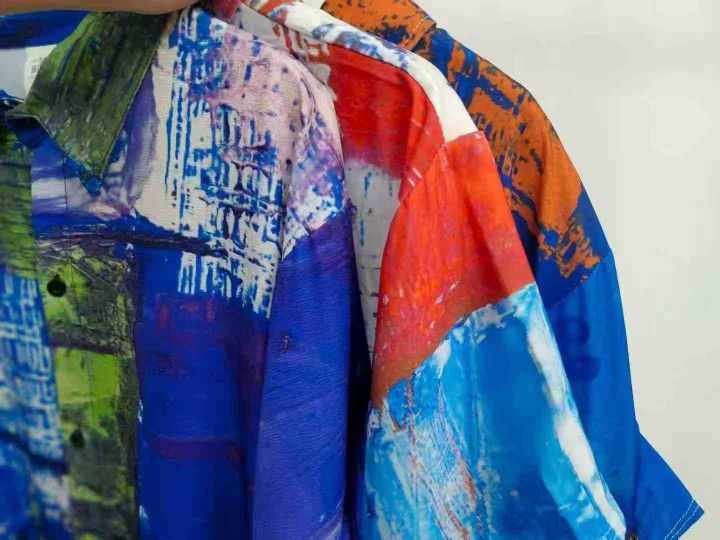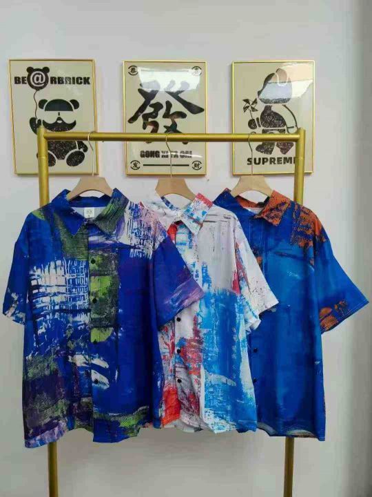 天猫在售款235件高品质男女同款夏季薄款扎染短袖花衬衫,品质做工好,带微弹,单款三色,L-2XL,独立包装带吊牌
