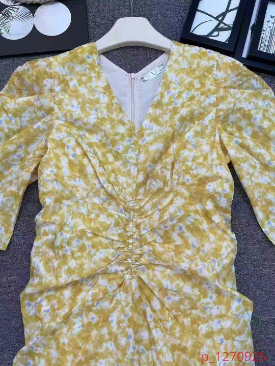 ☕️整款连衣裙茶歇法式黄色V领碎花连衣裙女夏气质优...