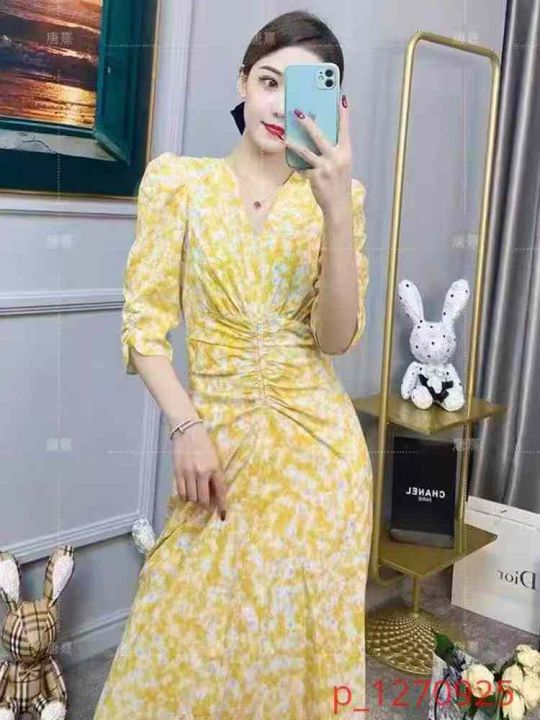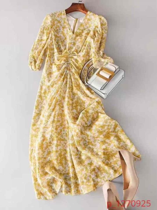 茶歇法式黄色V领碎花连衣裙女夏气质优雅温柔风修身收腰长裙