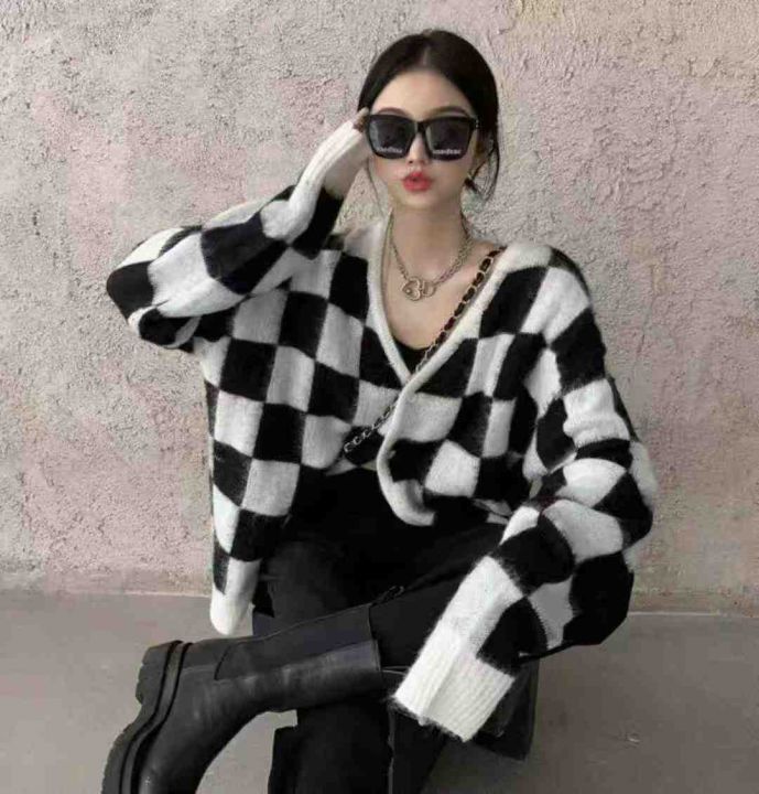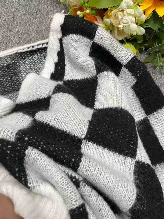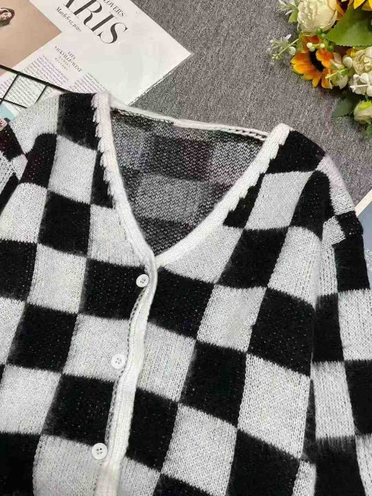 秋冬新款慵懒风棋盘格设计感宽松毛衣开衫,独立包装,...