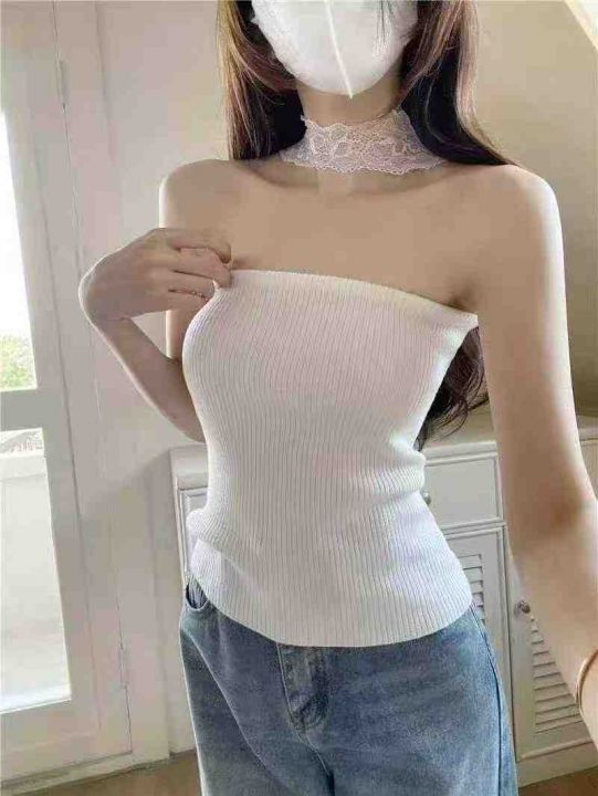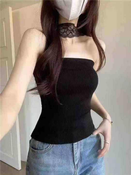 夏季新款性感辣妹纯欲风蕾丝挂脖纯色针织抹胸背心,独...