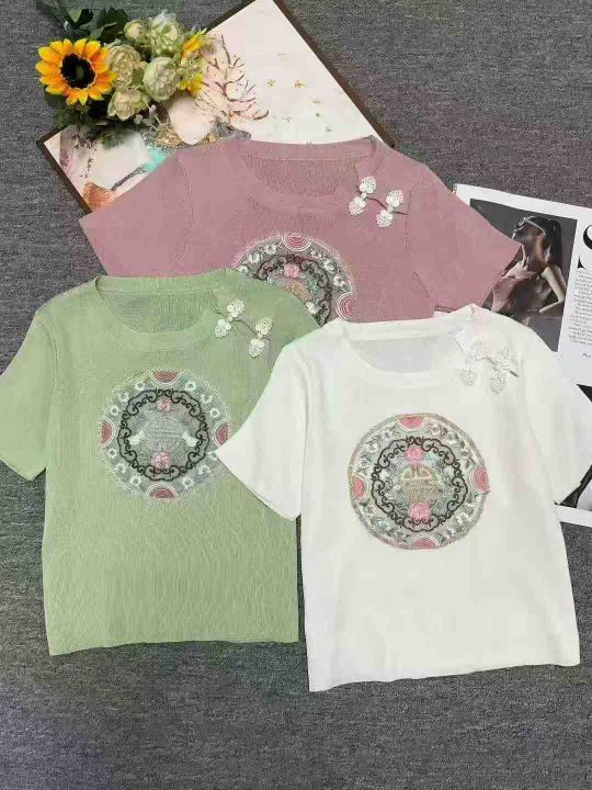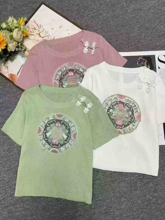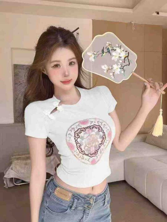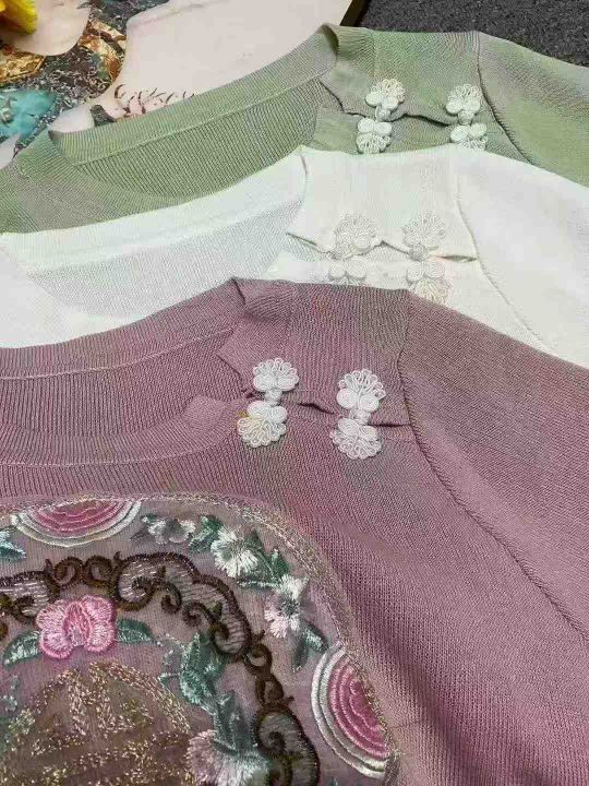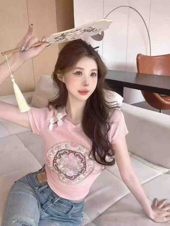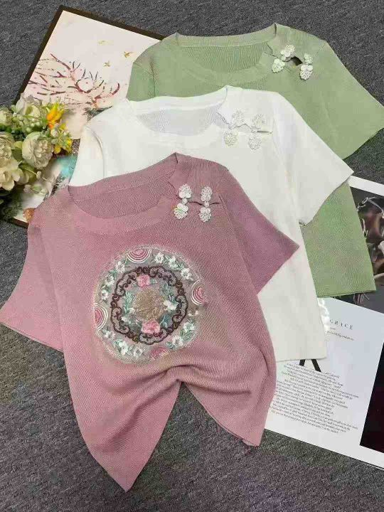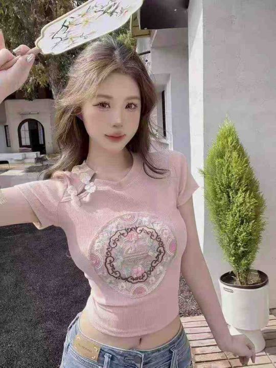 夏季新款辣妹法式新中式国风旗袍盘扣刺绣短款弹力修身显瘦针织小衫,独立包装,均码面料柔软舒适,266件,全清6.9元超低价秒杀!分货加一!