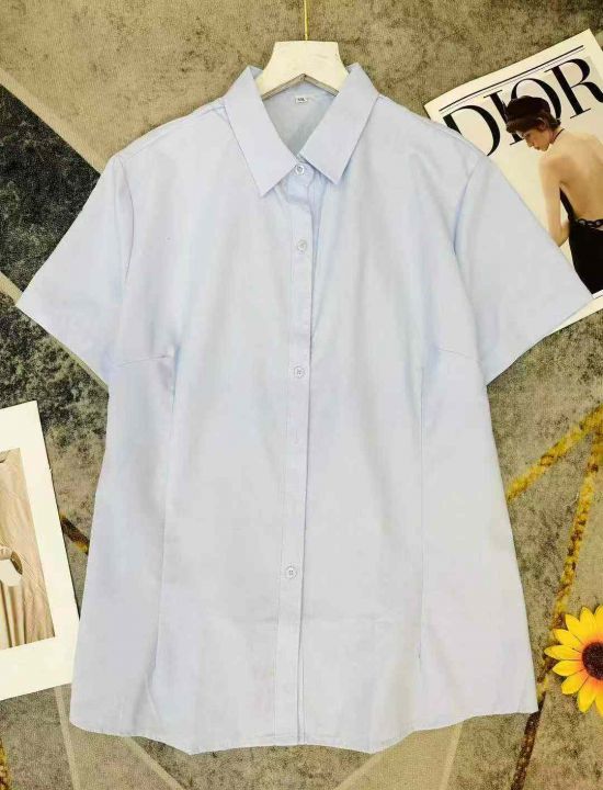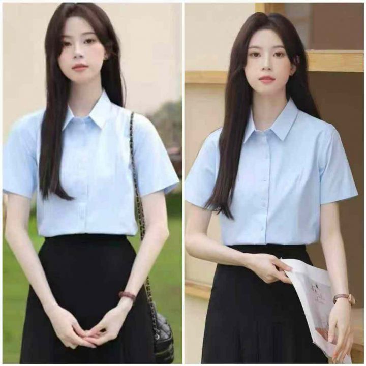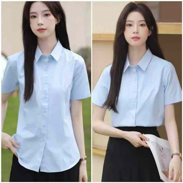 蓝色职业衬衫女短袖修身工作服公务员面试工装正装衬衣,淡蓝色温柔可亲[色],面料舒适透气,基础款️单穿️叠穿,轻松百搭,轻薄面料设计感更加分[哇],修身设计藏肉显瘦,超有性价比,分货9.9