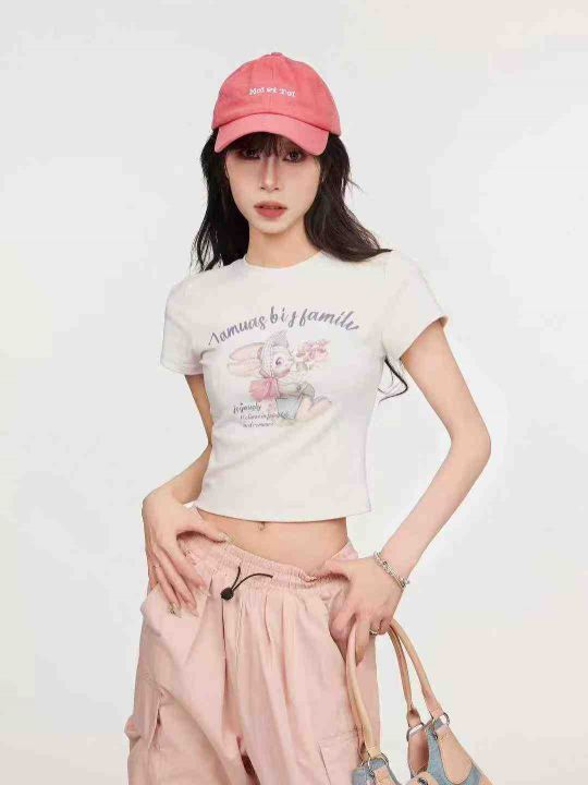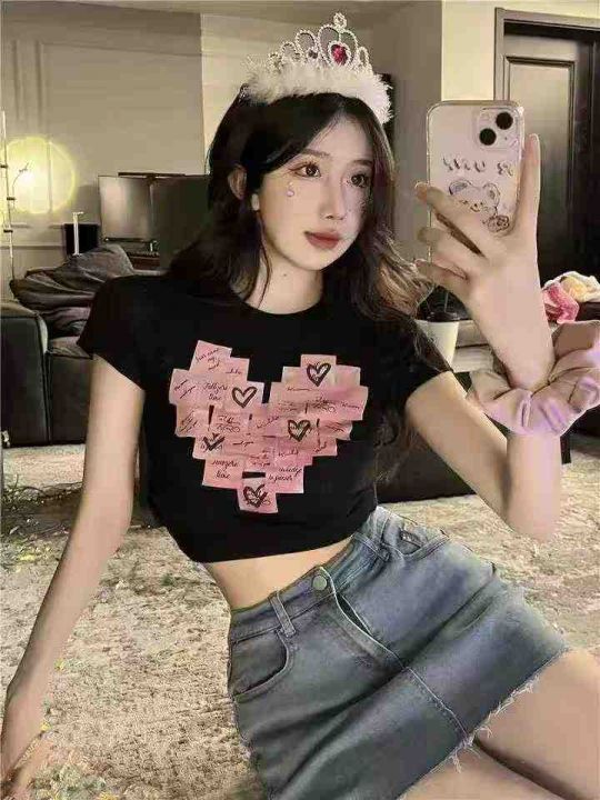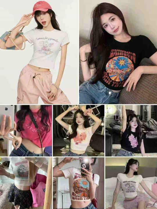 辣妹短袖t恤女夏ins设计感小众纯欲女短款露脐辣妹小众设计感热辣上衣,黑白色多图案,大弹力,码数:1-4,独立包装,1288件,分货➕1