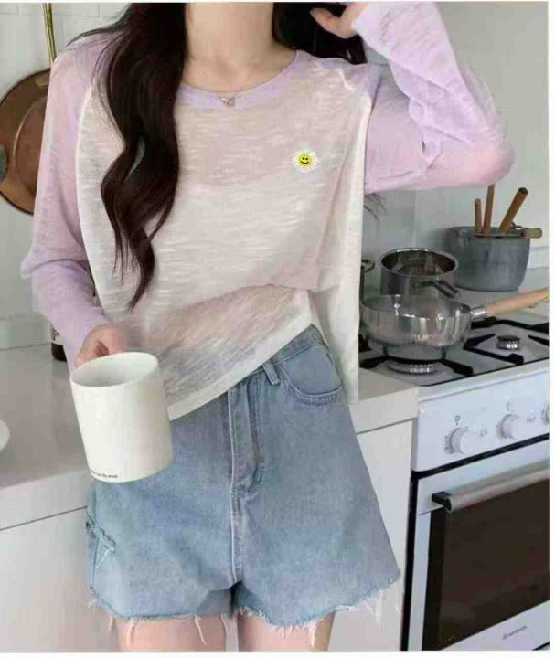 早秋新款撞色宽松韩系薄款宽松别致独特刺绣圆领长袖针...