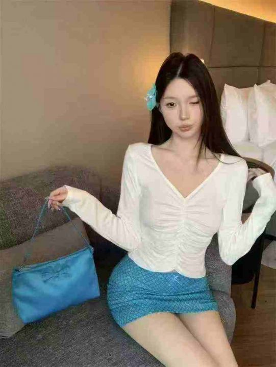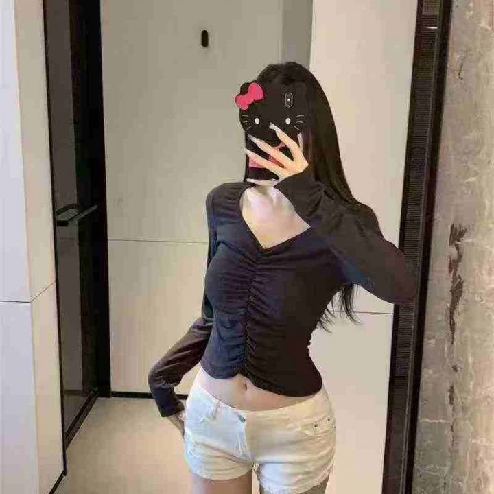 设计褶皱锁骨长袖辣妹修身新款收腰显瘦针织上衣,独立...