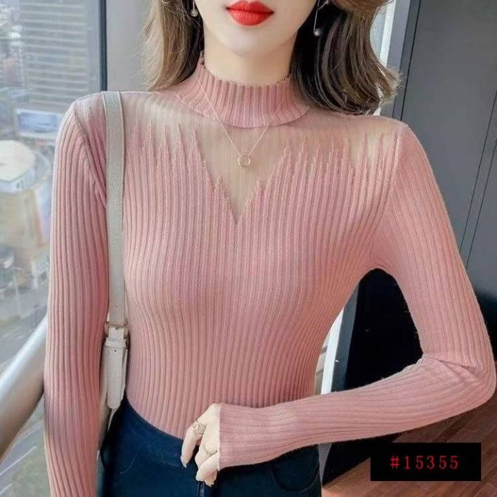 秋冬新款网纱拼接弹力修身显瘦半高领打底洋气坑条包芯纱套头毛衣,独立包装...