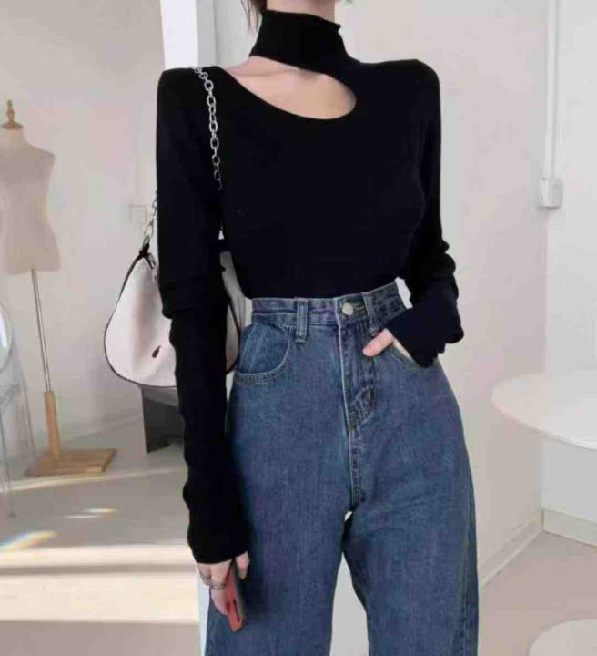 秋季新款设计款弹力修身显瘦挂脖长袖包芯纱套头毛衣,...