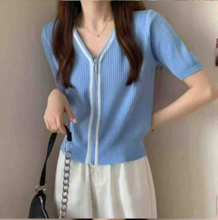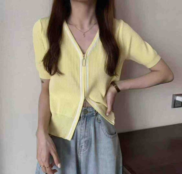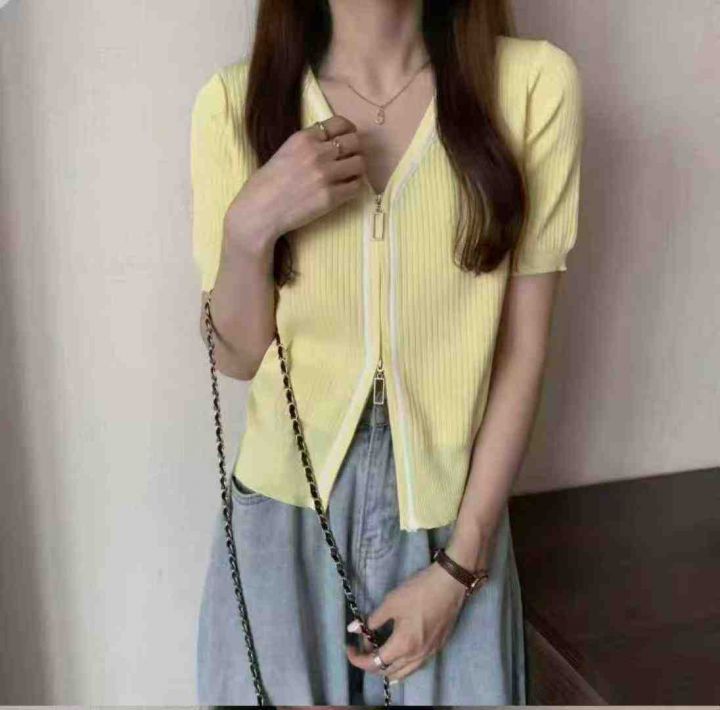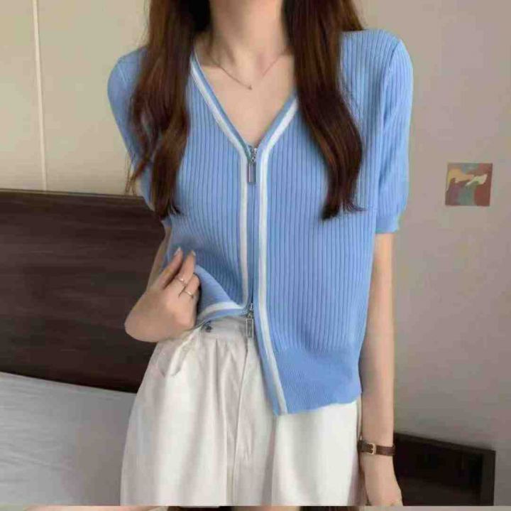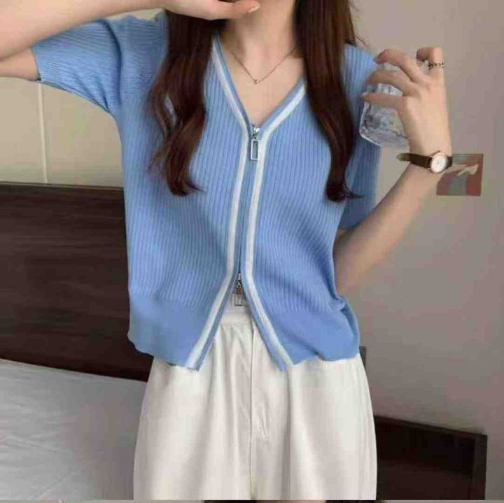 夏季新款冰丝设计感v领双头拉链短袖针织开衫,独立包...