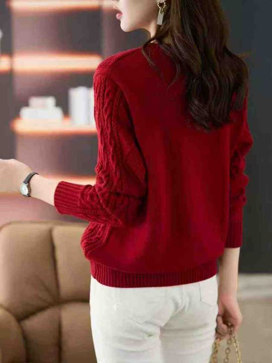 秋季新款宽松显瘦V领红色套头毛衣,独立包装,均码面...