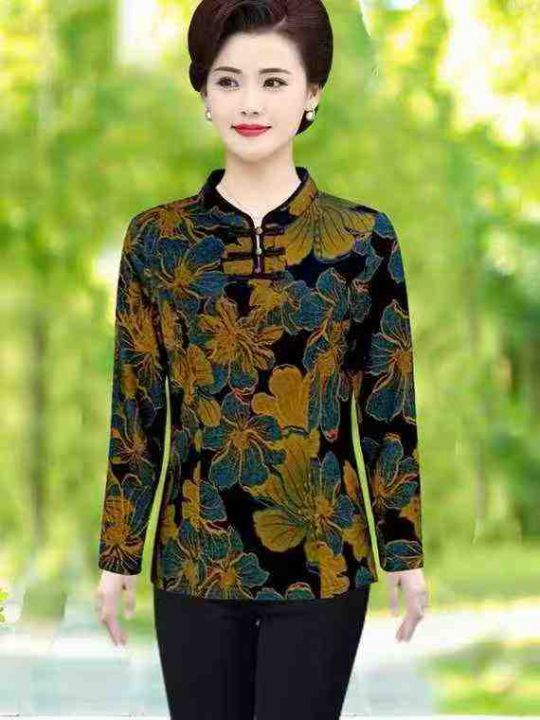 早秋新款时尚妈妈复古洋气民族风花色经典盘扣宽松长袖...