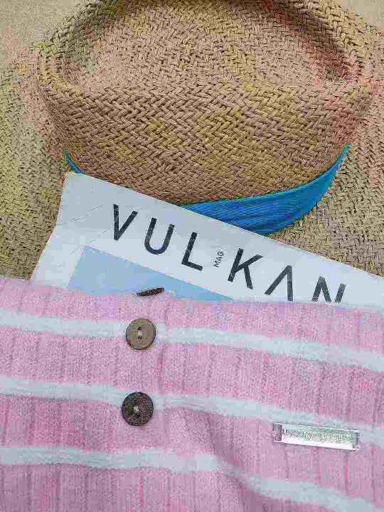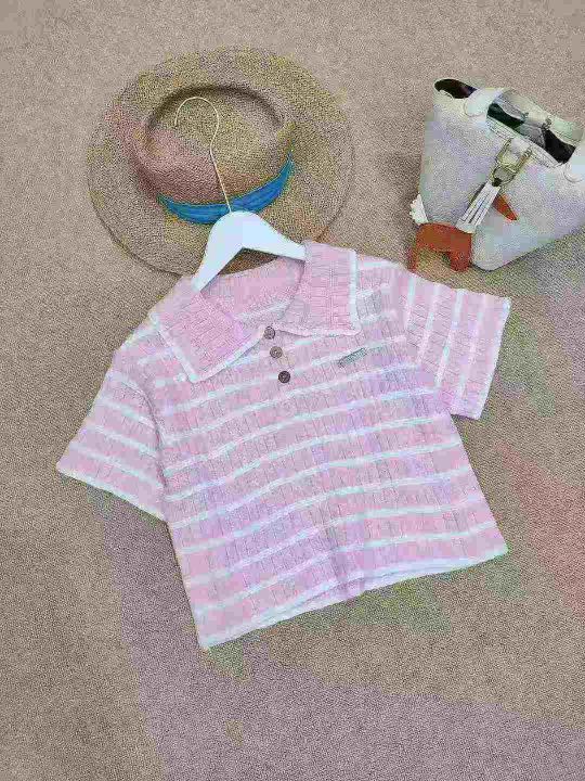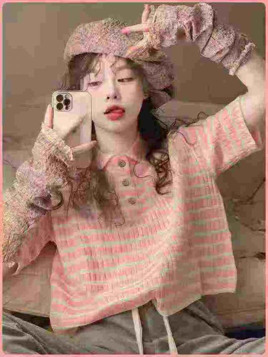 [月亮]:奶系别致粉Polo领条纹针织衫毛衣上衣